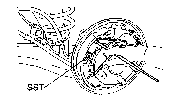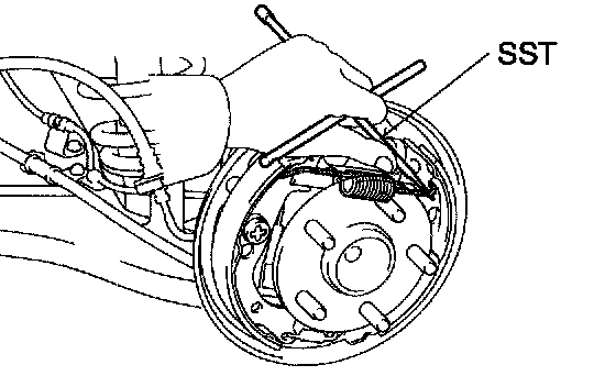 a. Using SST, disconnect the return spring from the front brake shoe.