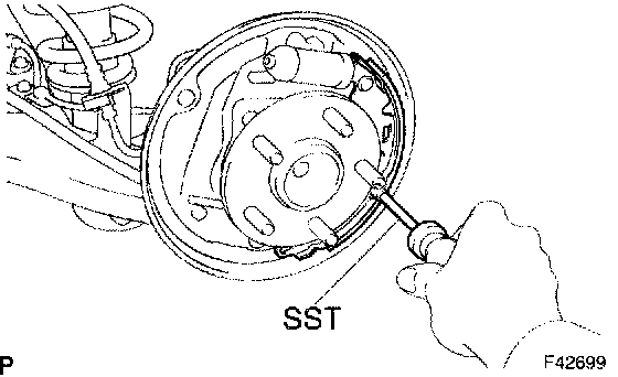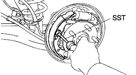 b. Using SST, install the rear brake shoe, pin, shoe holddown spring and 2 cups.