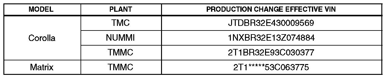 ^ 2003 model year Corolla and Matrix vehicles produced BEFORE the Production Change Effective VINs shown below.