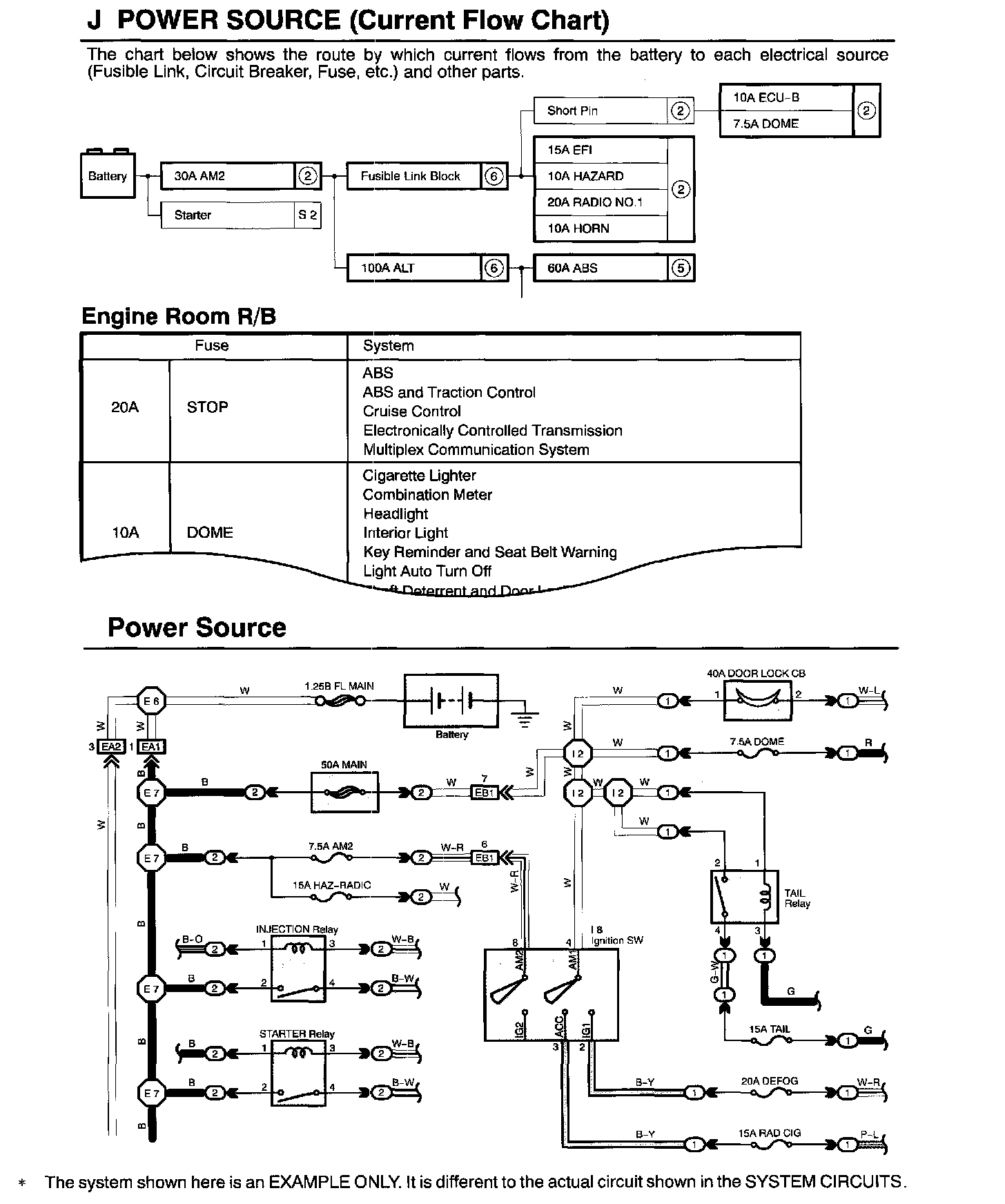The "Current Flow Chart", describes which parts each power source (fuses, fusible links, and circuit breakers) transmits current to. In the Power Source circuit diagram, the conditions when battery power is supplied to each system are explained. Since all System Circuit diagrams start from the power source, the power source system must be fully understood.