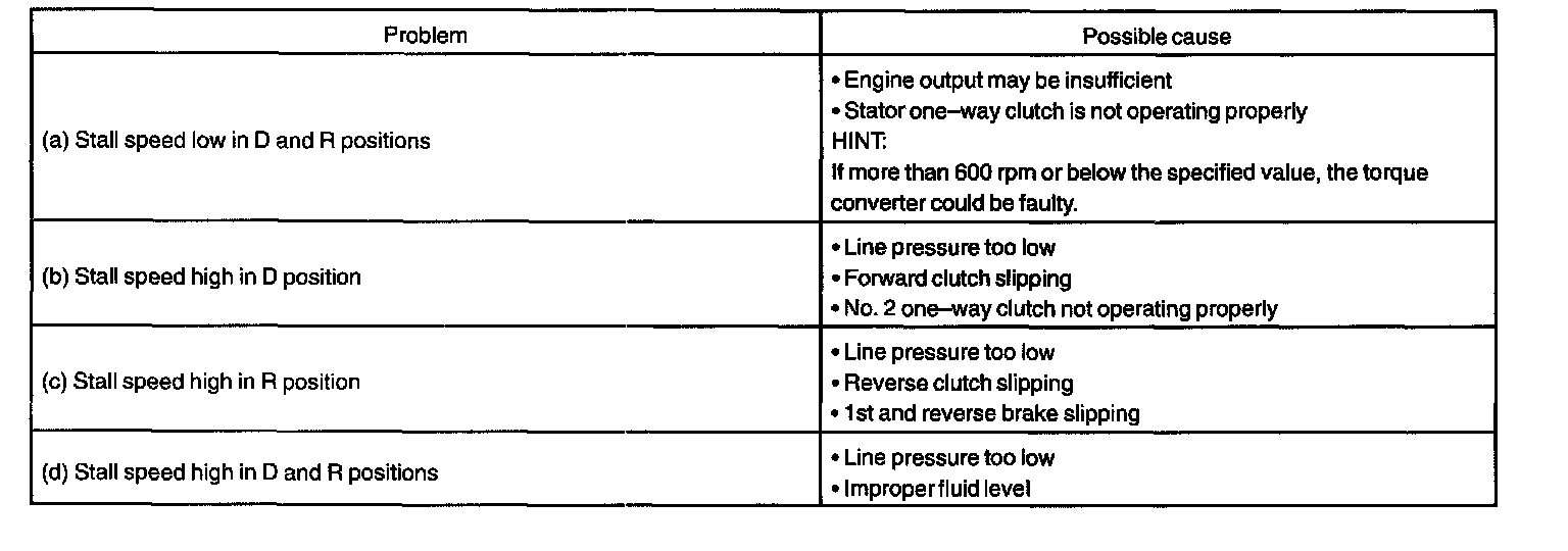 The object of this test is to check the overall performance of the transaxle and engine by measuring the stall speeds in the D and R positions.