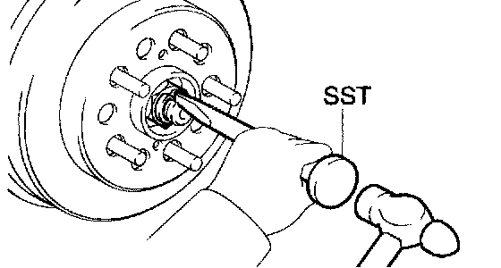 a. Using SST and a hammer, unstake the staked part of the rear axle shaft LH nut.