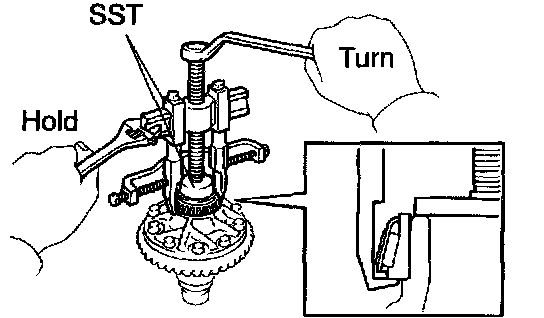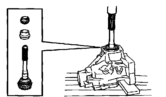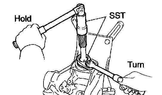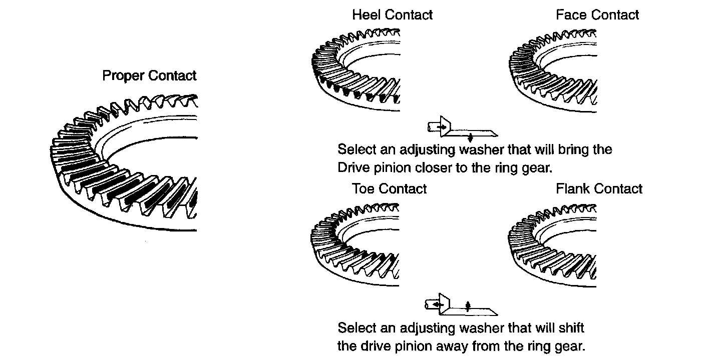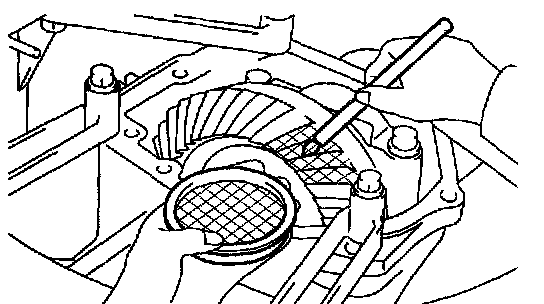 ^ Even if the tightening torque of gear nut exceeds the specified torque, if the preload is not enough, loosen the gear nut once and apply rust preventive oil or gear oil super to the gear nut and to the screw or bearing surface of driven pinion. Then do the procedure again. If the tightening torque is smaller than the specified value, replace the pinion bearing spacer with a new one and adjust it.