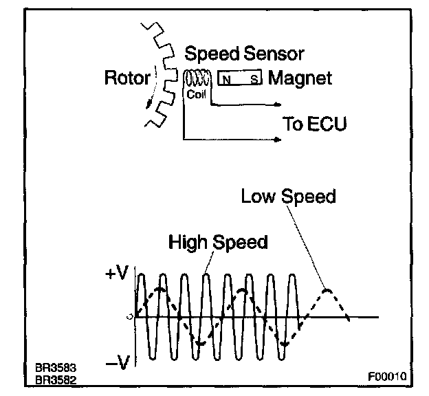 When the rotors rotate, the magnetic field generated by the permanent magnet in the speed sensor induces an AC voltage. Since the frequency of this AC voltage changes in direct proportion to the speed of the rotor, the frequency is used by the ECU to detect the speed of each wheel.