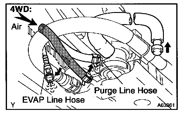 a. Disconnect the purge line hose and EVAP line hose from the charcoal canister.