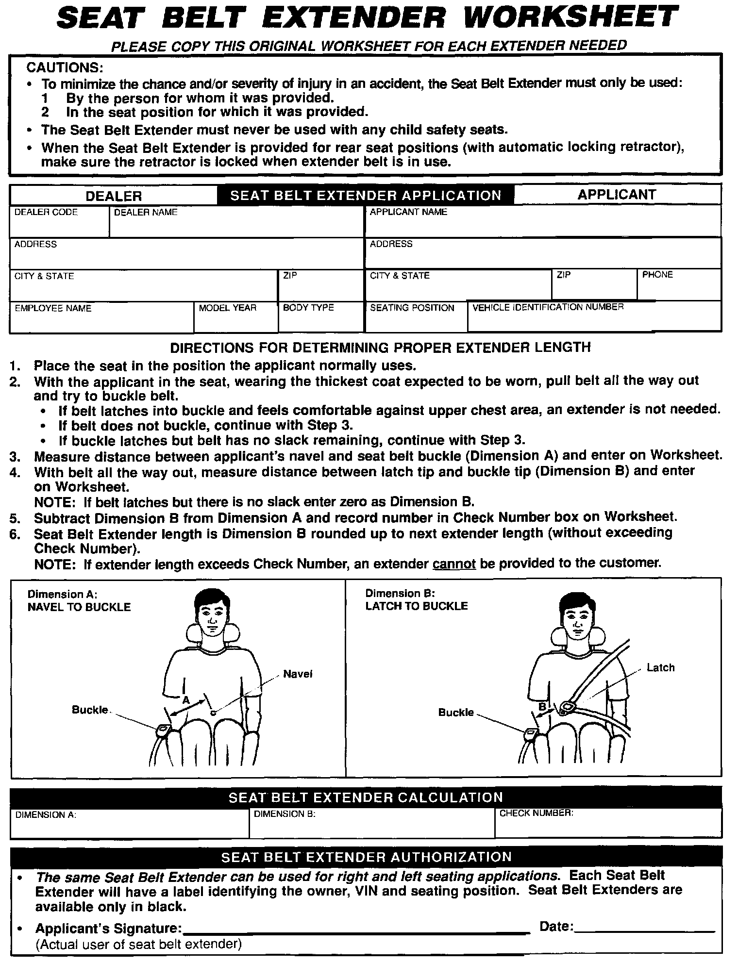 2. Dealer verifies the need for a Seat Belt Extender and obtains a current copy of this TSB and copies the Worksheet.