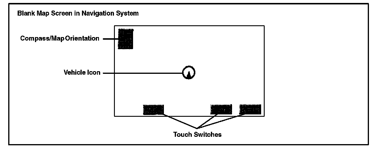 In some cases, when a vehicle arrives at a U.S. or Canadian port, and/or is in new inventory at the dealer, a blank map screen may occur, as shown below, just after turning the ignition switch ON and then touching the "I agree" switch. The only items that can be seen are the touch switches, compass, and the vehicle icon.