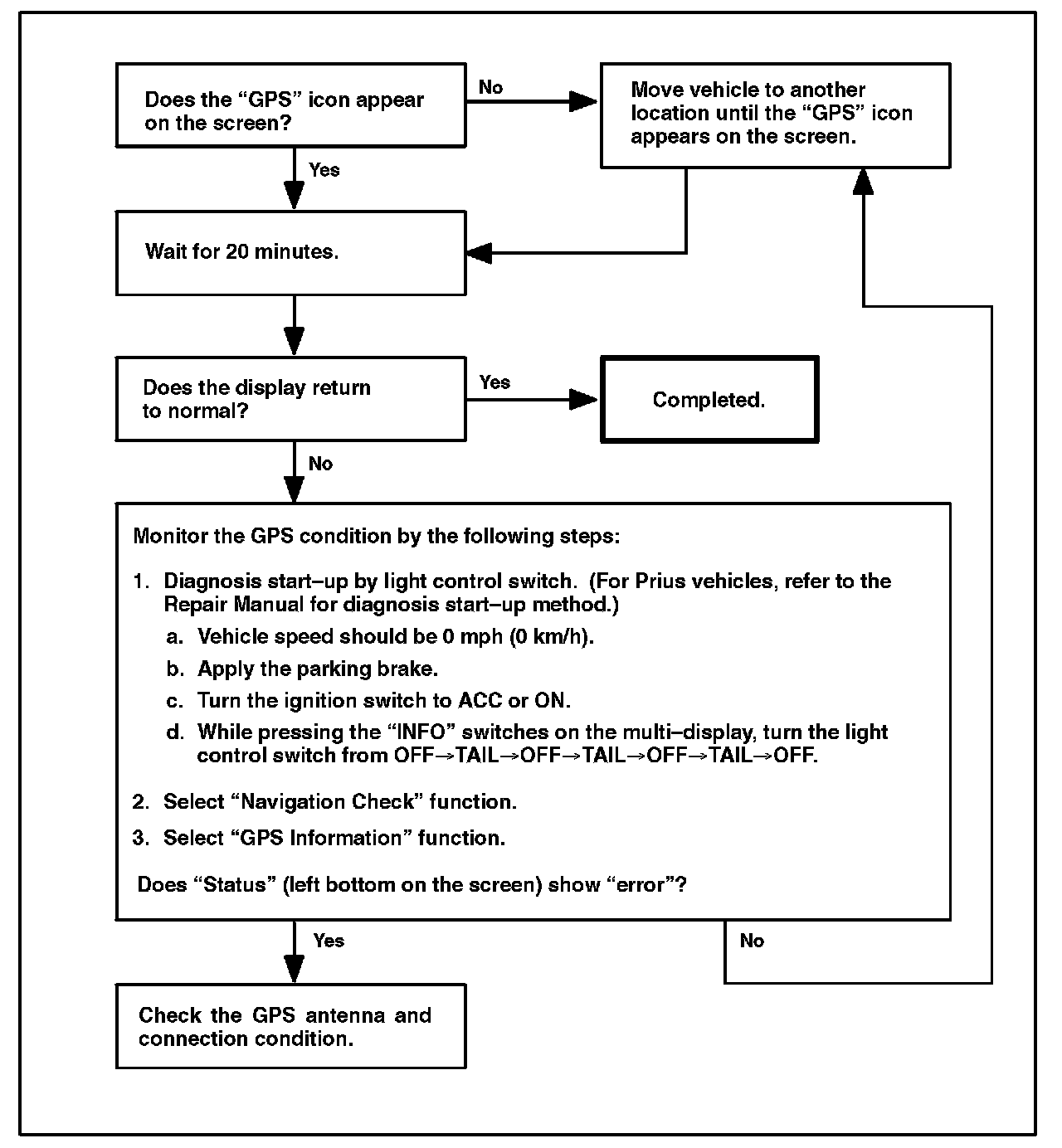 This condition is not a system failure. This is due to the system position memory originally identifying a set location near the manufacturing plant in Japan when the vehicle is brand-new. To re-initialize the navigation system memory location, follow the instructions shown.