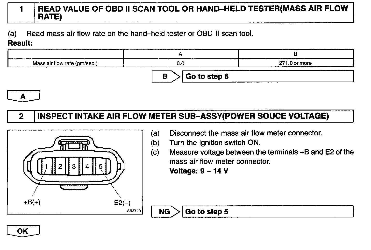 HINT: After confirming DTC P0100, use the OBD II scan tool or hand-held tester to confirm the air flow ratio from CURRENT DATA.