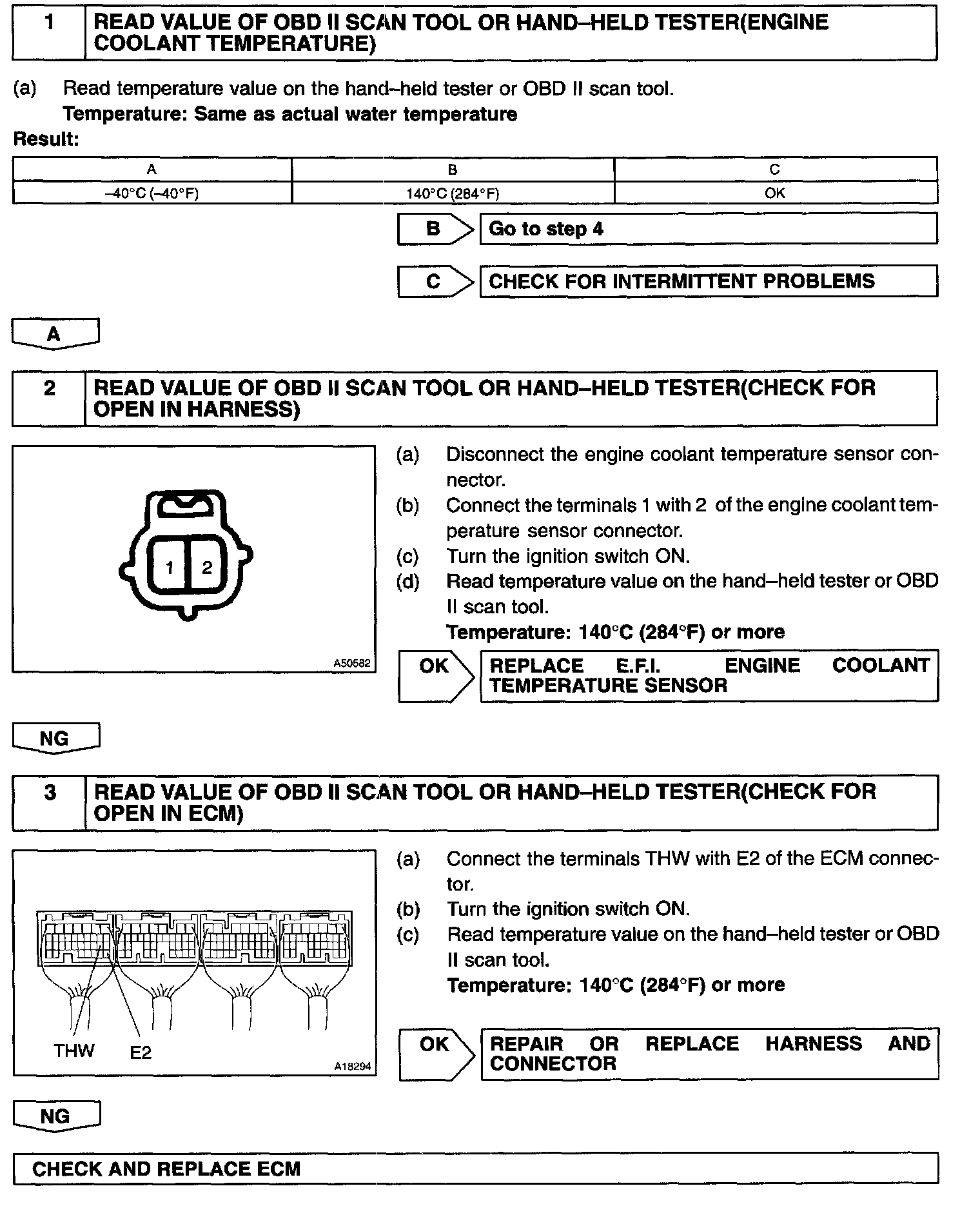HINT: After confirming DTC P0115, use the hand-held tester or OBD II scan tool to confirm the engine coolant temperature from "CURRENT DATA".