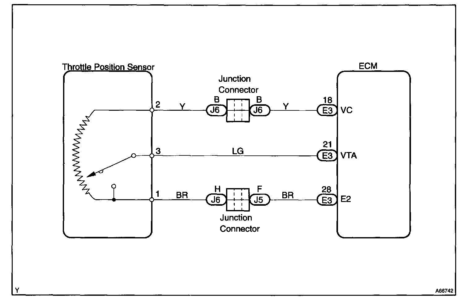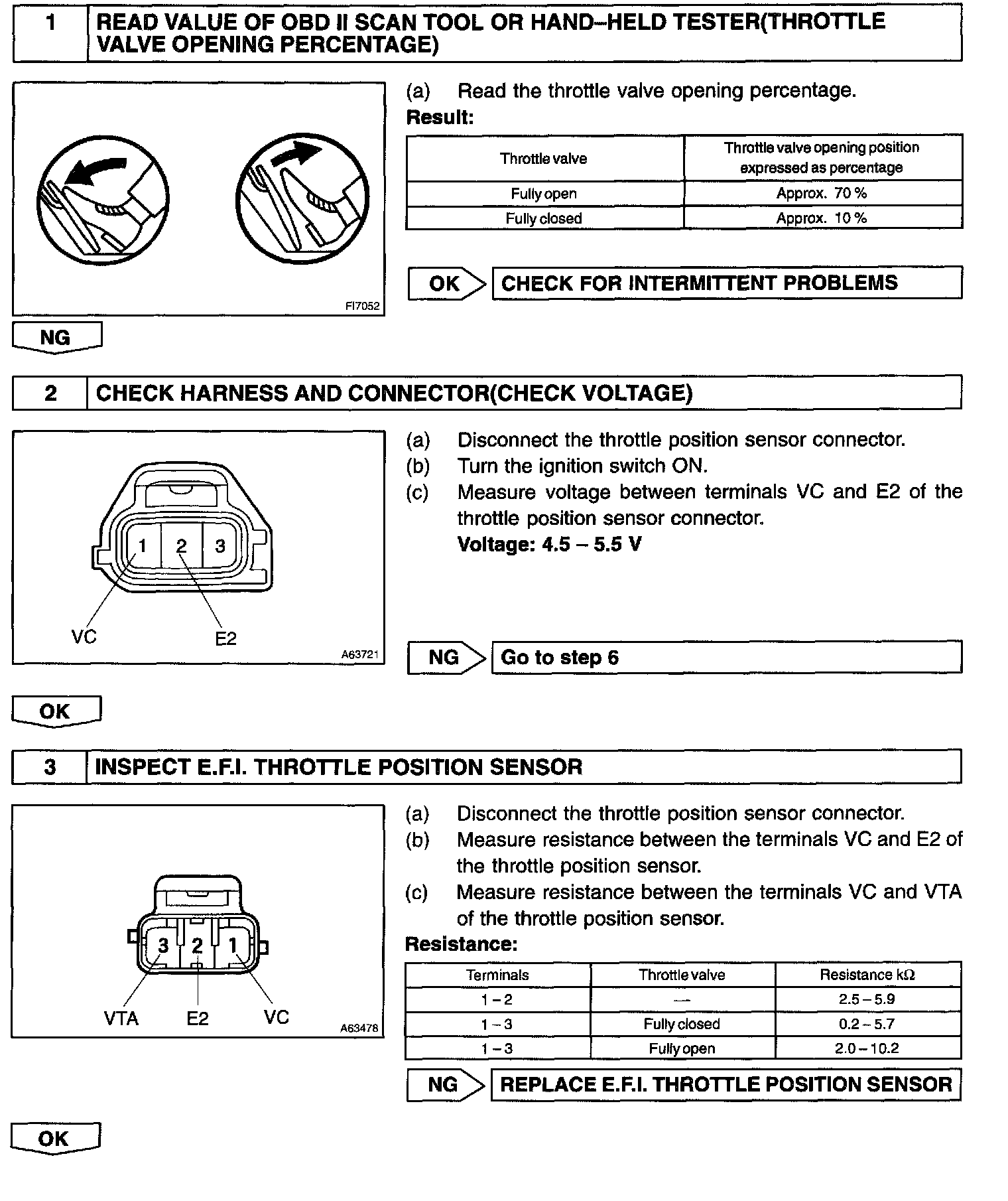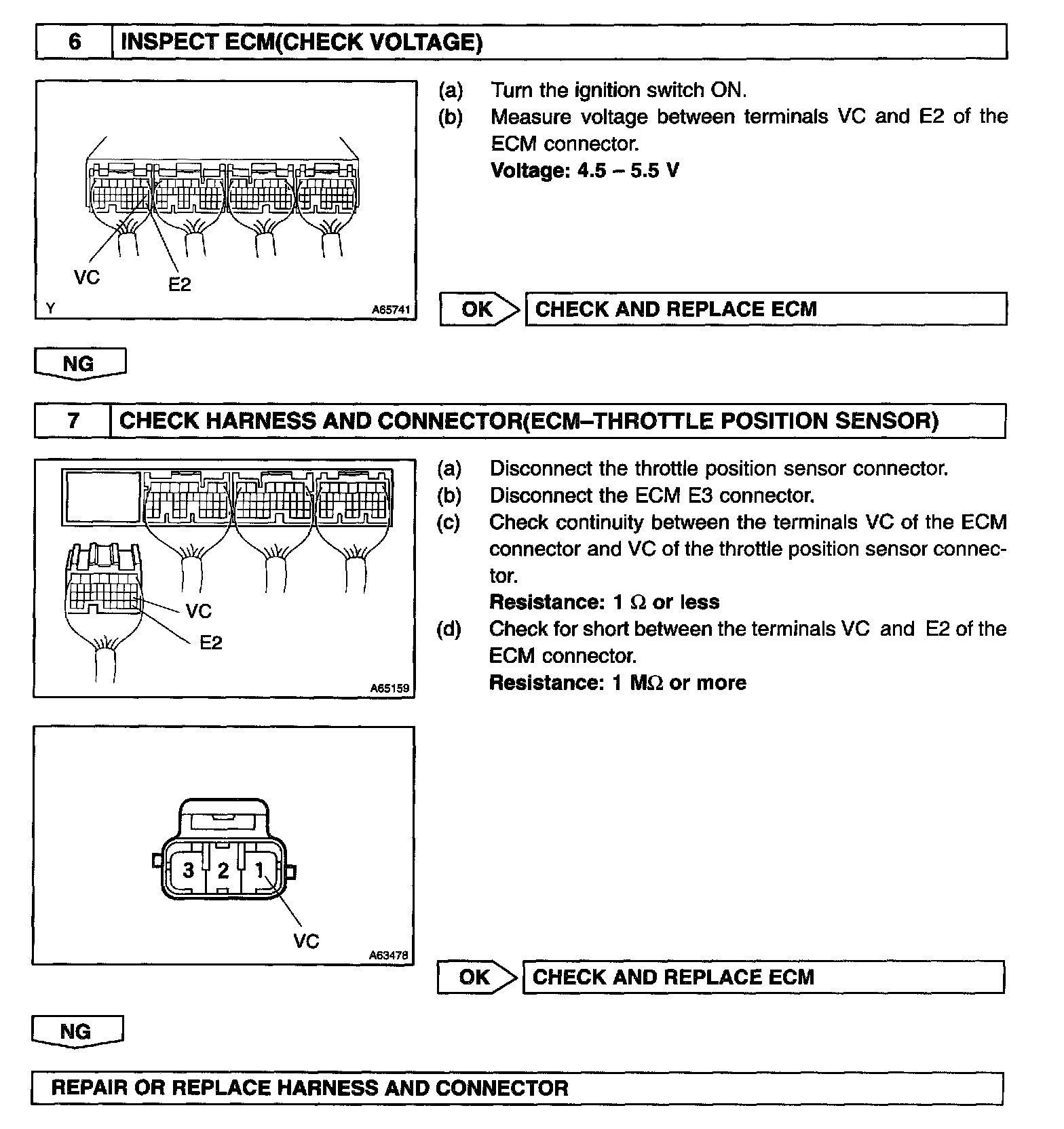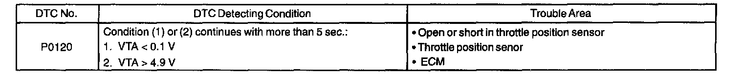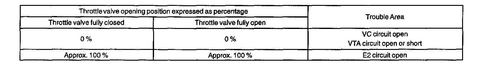 When the throttle valve is fully closed, a voltage of approximately 0.3 - 1.0 V is applied to terminal VTA of the ECM. The voltage applied to the terminals VTA of the ECM increases in proportion to the opening angle of the throttle valve and becomes approximately 3.2 - 4.9 V when the throttle valve is fully opened. The ECM judges the vehicle driving conditions from these signals input from terminal VTA, uses it as one of the conditions for deciding the air-fuel ratio correction, power increase correction and fuel-cut control etc.