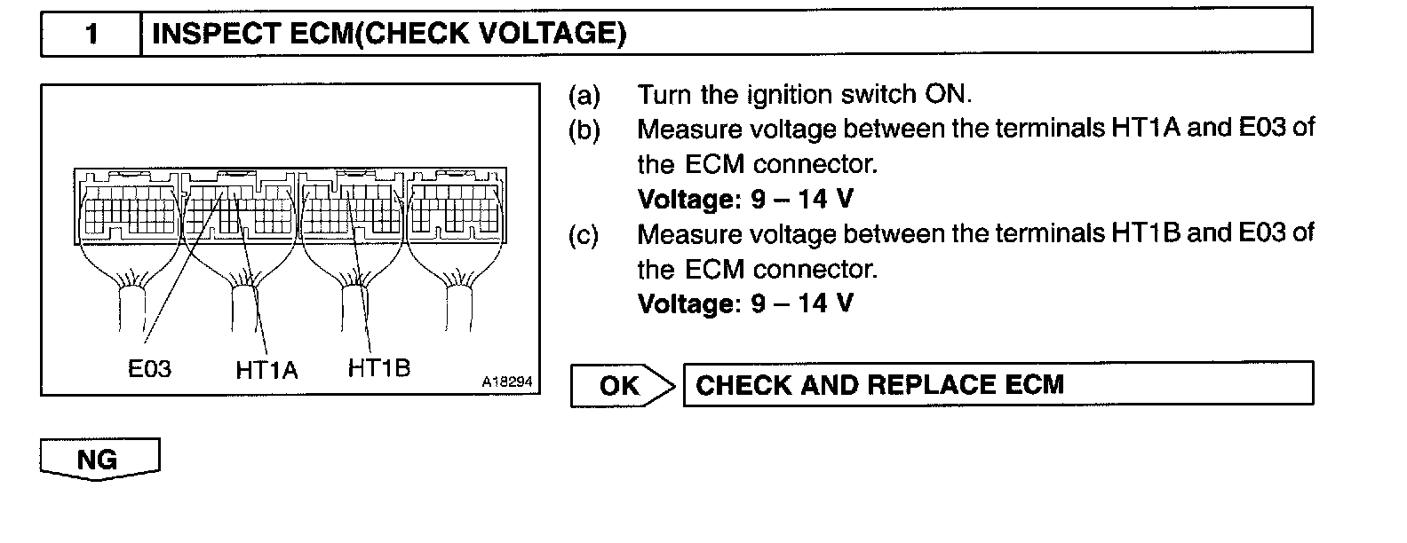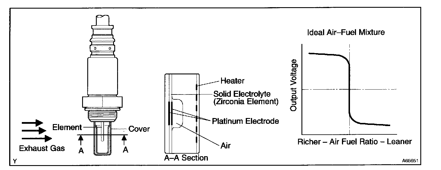 The oxygen sensor is equipped with a heater which heats the zirconia element. The heater is controlled by the ECM. When the intake air volume is low (the temperature of the exhaust gas is low), the current flows to the heater to heat the sensor for the accurate oxygen concentration detection.