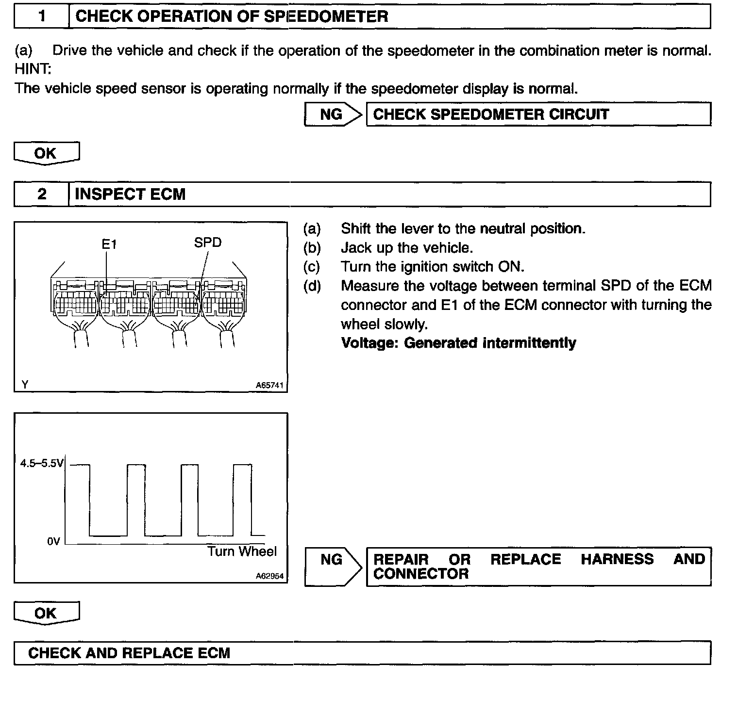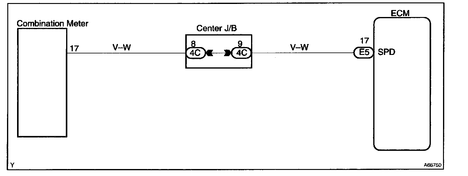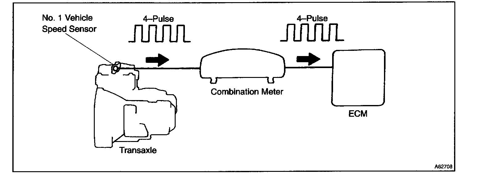 The vehicle speed sensor outputs a 4-pulse signal for every revolution of the rotor shaft, which is rotated by the transmission output shaft via the driven gear. After this signal is converted into a more precise rectangular waveform by the waveform shaping circuit inside the combination meter, it is then transmitted to the ECM. The ECM determines the vehicle speed based on the frequency of these pulse signals.
