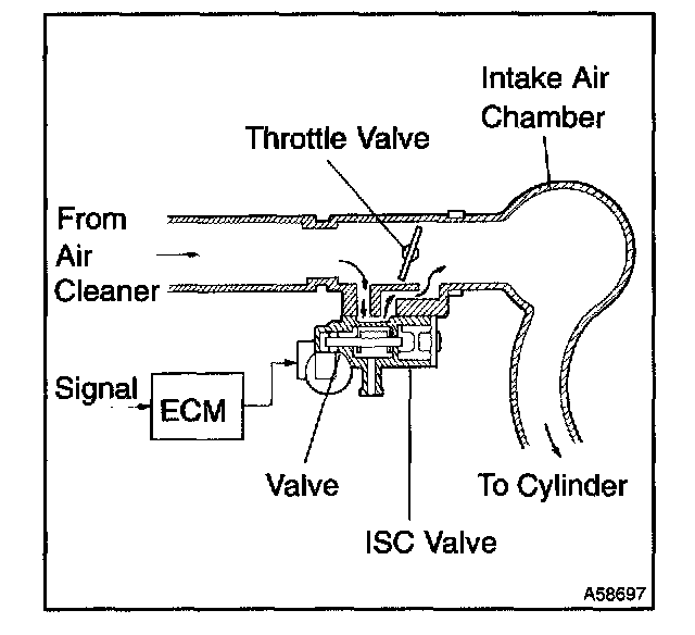 The rotary solenoid type ISC valve is located under the throttle body and intake air bypassing the throttle valve is directed to the ISC valve through the passage.