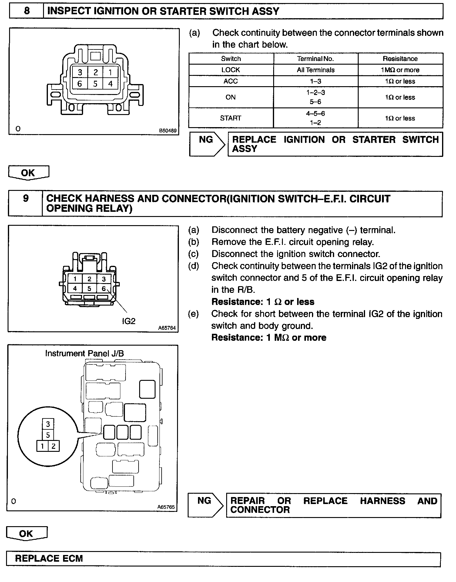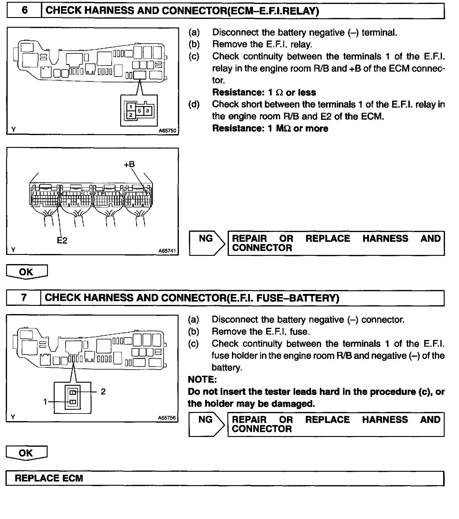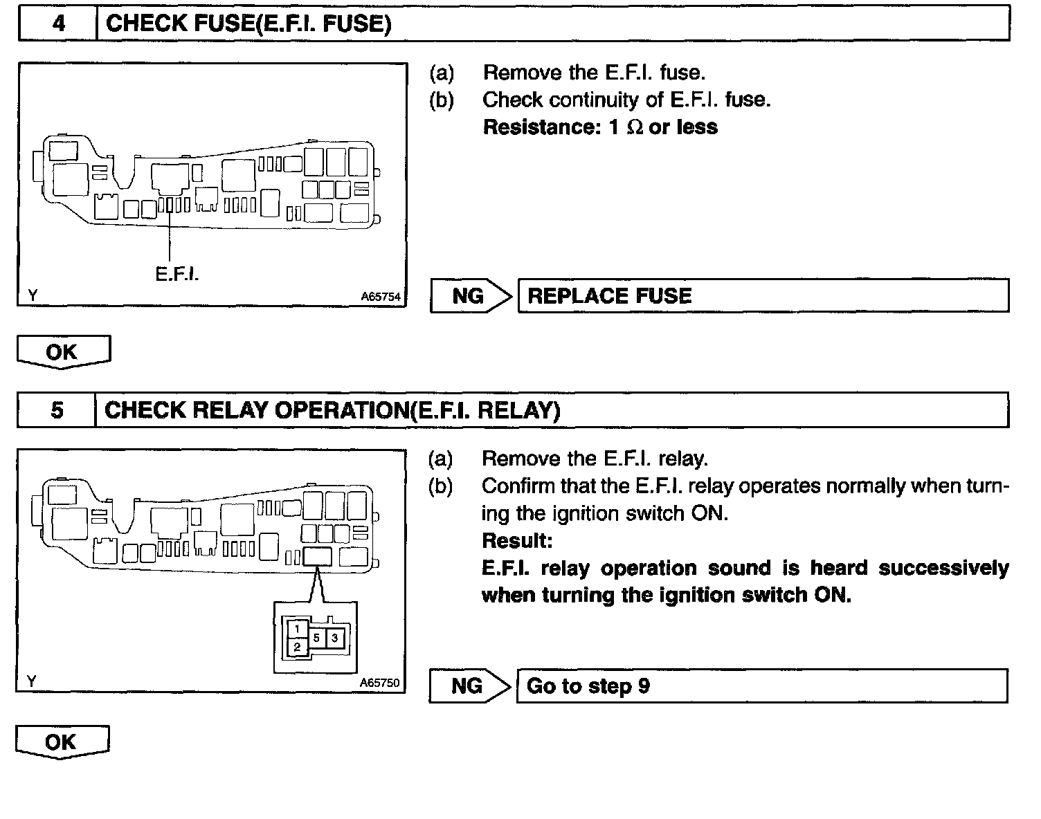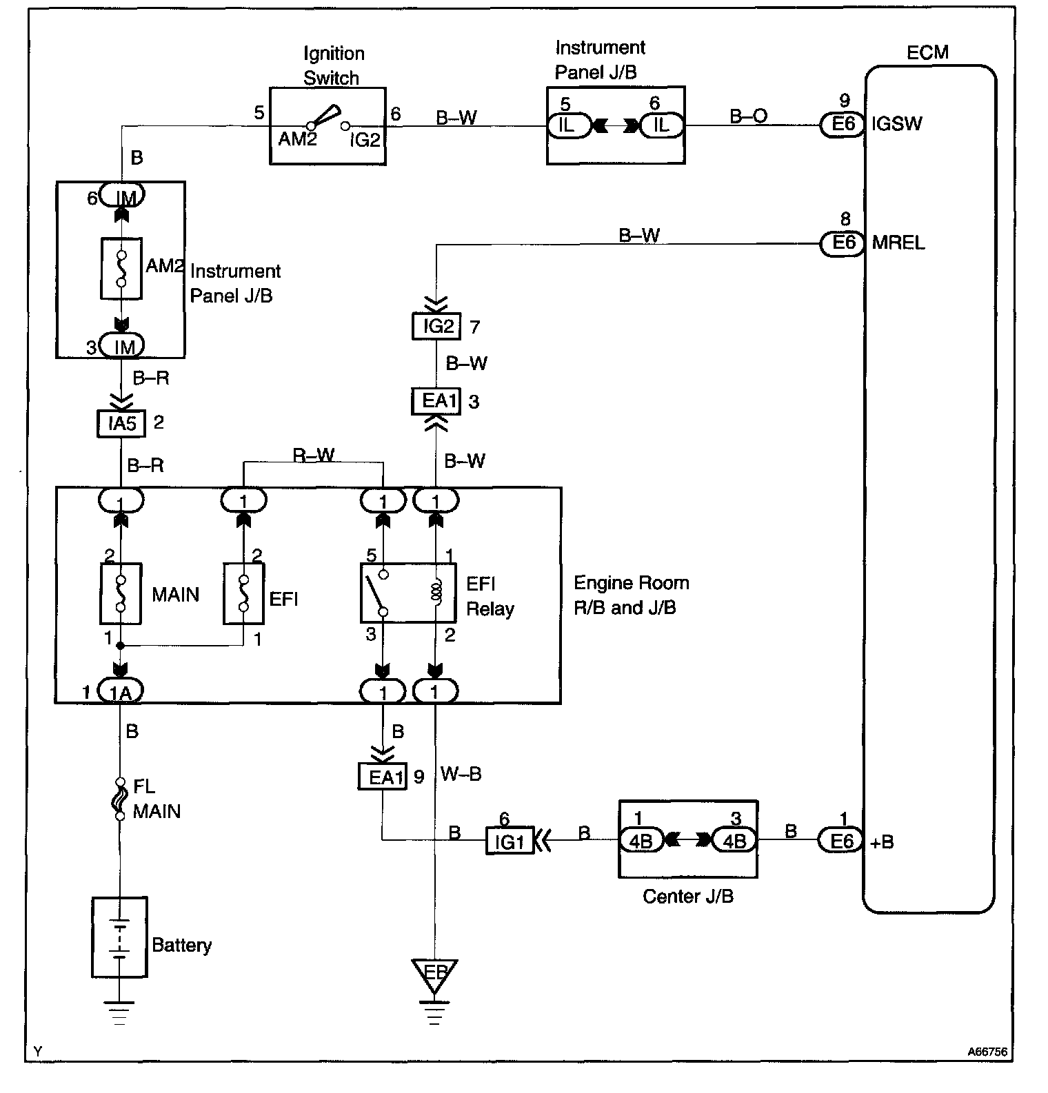 CIRCUIT DESCRIPTIONWhen the ignition switch is turned ON, battery positive voltage is applied to the coil which closes the contacts of the E.F.I. relay (Marking: E.F I.) and supplies power to the terminal +B of the ECM.