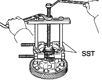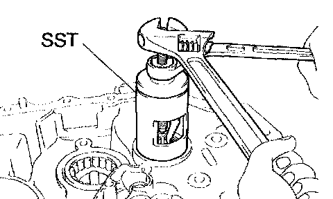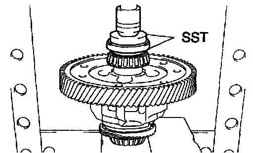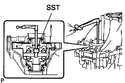 c. Using SST and a torque wrench, turn the deferential case assy right and left 2 or 3 times to allow the bearings to settle.
