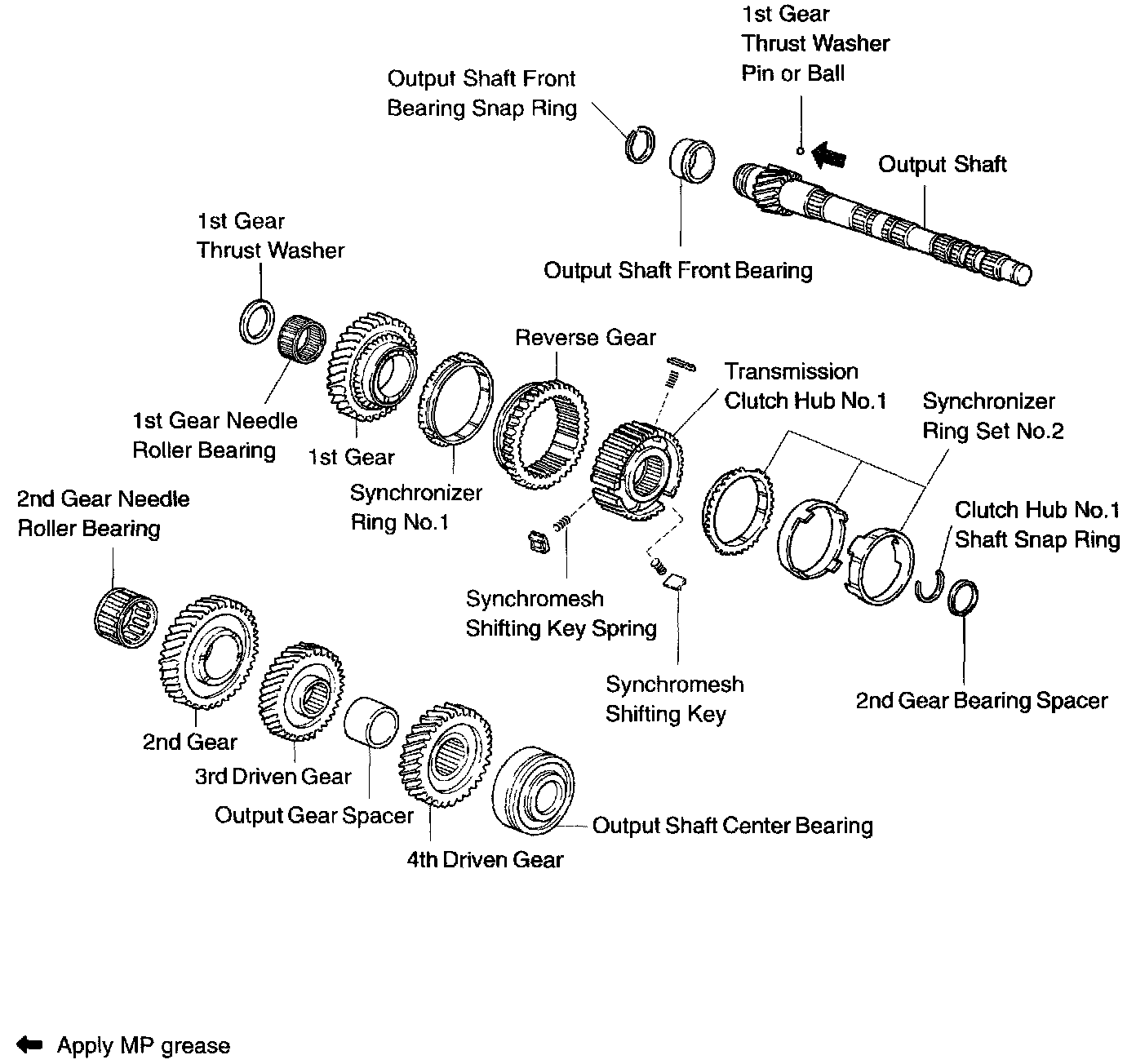 a. Coat the 1st gear thrust washer pin or ball with MP grease, install it to the output shaft.