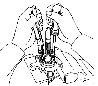 b. Remove the shift & select lever shaft support and reverse select pin compression spring from the control shaft cover.