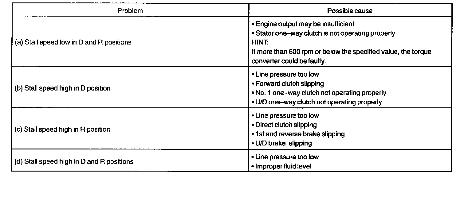 The object of this test is to check the overall performance of the transaxle and engine by measuring the stall speeds in the D and R positions.