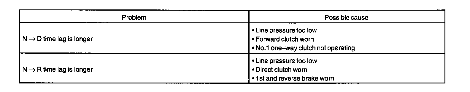 When the shift lever is shifted while the engine is idling, there will be a certain time lapse or lag before the shook can be felt. This is used for checking the conditions of the direct clutch, forward clutch, and 1st and reverse brake.