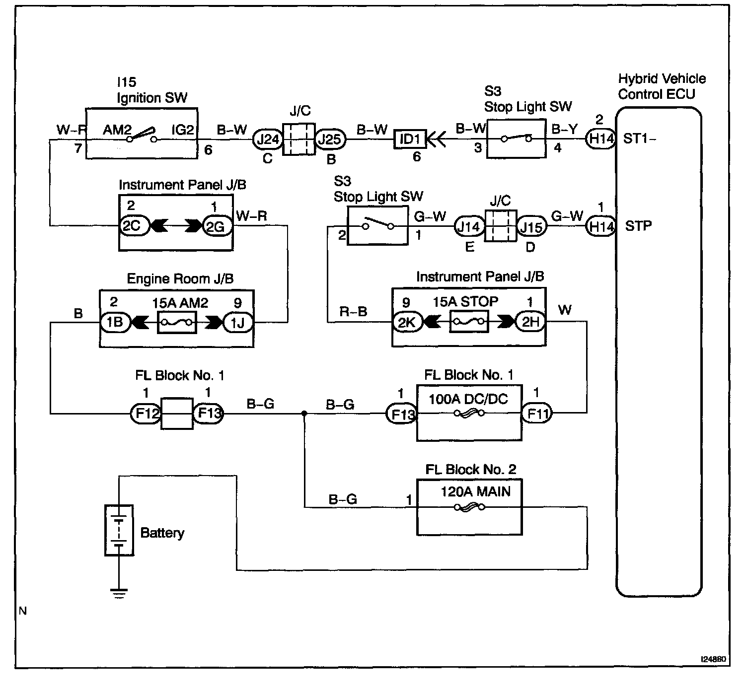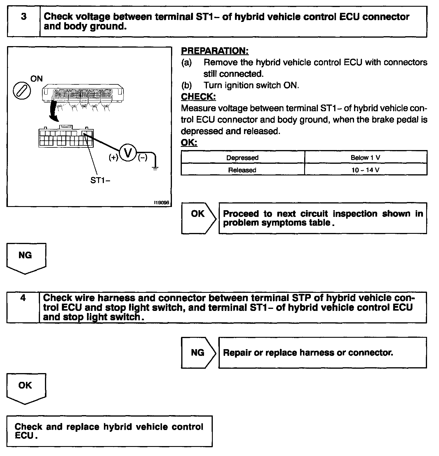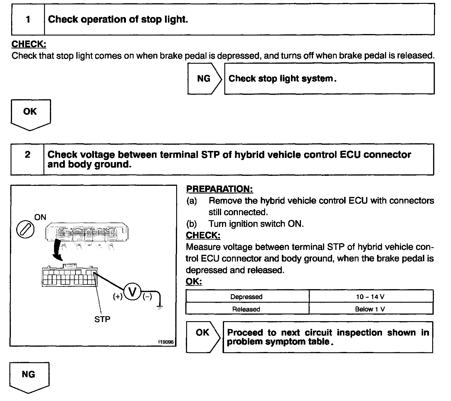 When the brake is on, battery voltage is normally applied through the STOP fuse and stop light switch to terminal STP of the hybrid vehicle control ECU, and the hybrid vehicle control ECU turns the cruise control OFF.