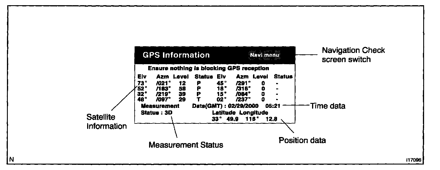 The angle of elevation of relevant satellite, azimuth signal level, and receiving condition of signals are displayed.