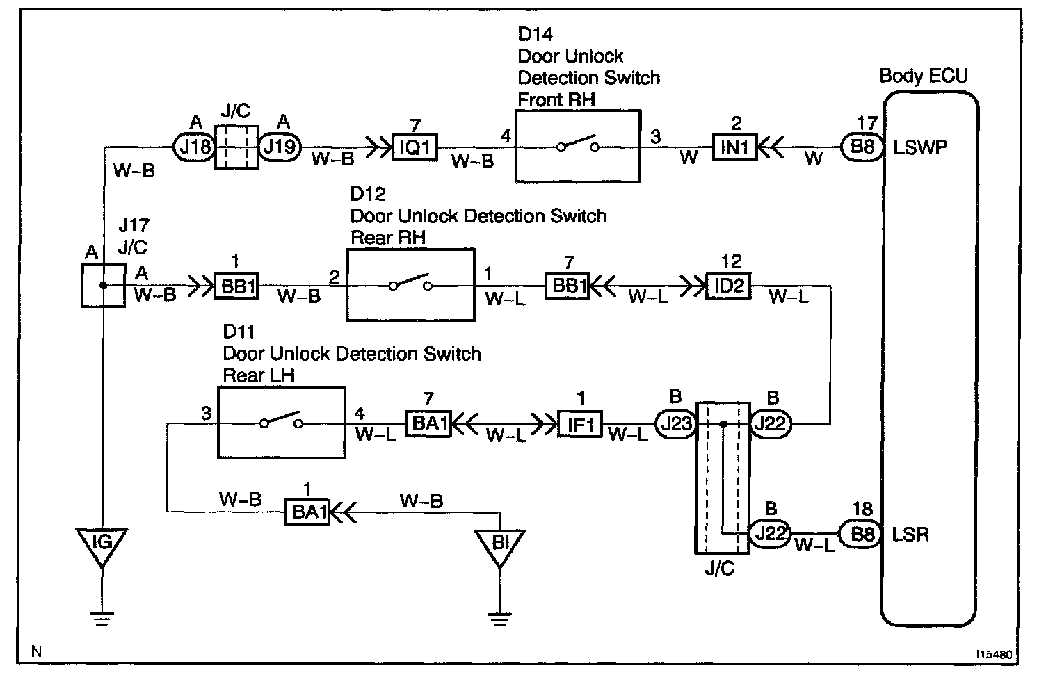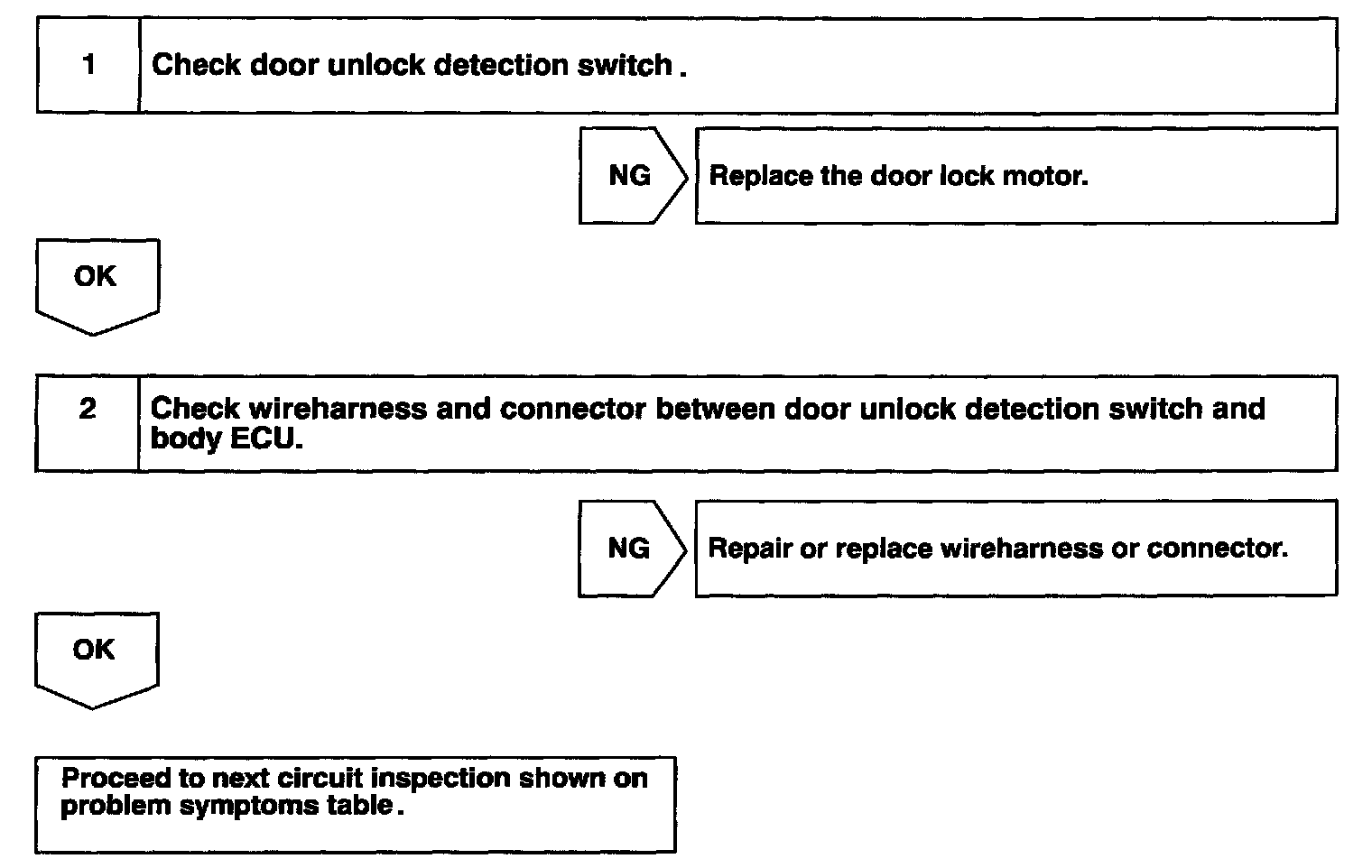 CIRCUIT DESCRIPTIONThe door unlock detection switch is built in the door lock motor assembly. This switch is ON when the door lock knob is in the unlock position and OFF when the lock knob is in the lock position. The ECU detects the door lock knob conditions is this circuit. It is used as one of the operating conditions for the key confinement prevention function.