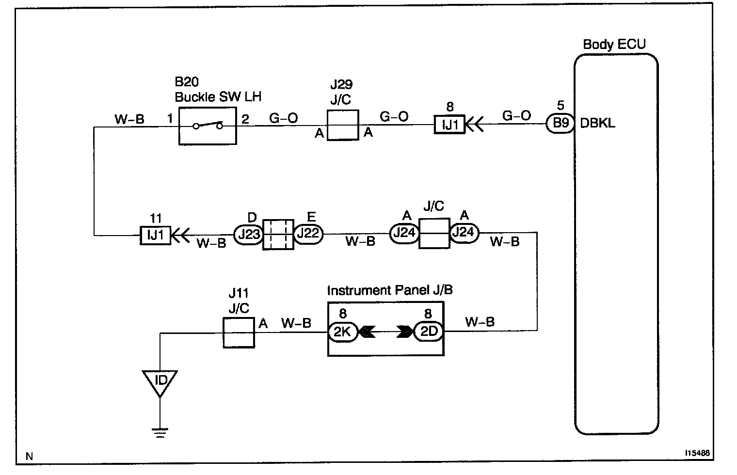CIRCUIT DESCRIPTIONWhen the buckle switch of the driver's seat is ON with the ignition switch ON, the body ECU sends a signal to make the seat belt warning light for the driver's seat light up and to sound a buzzer.
