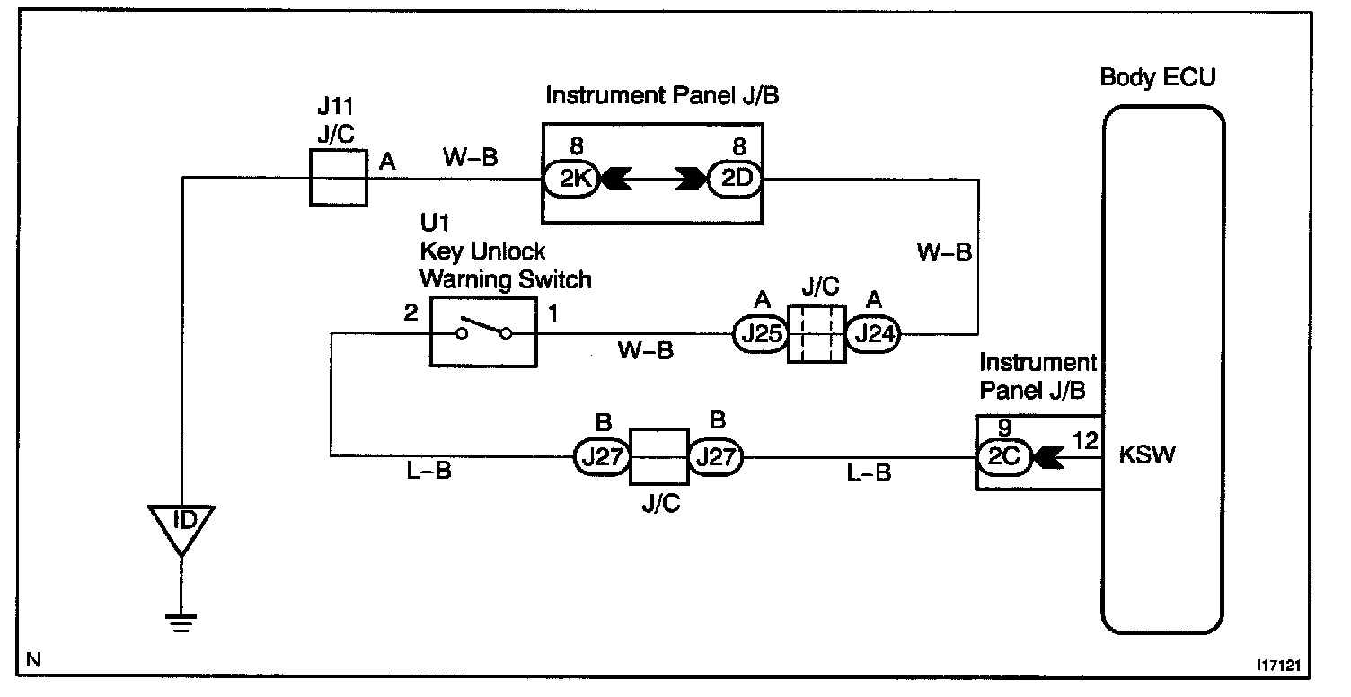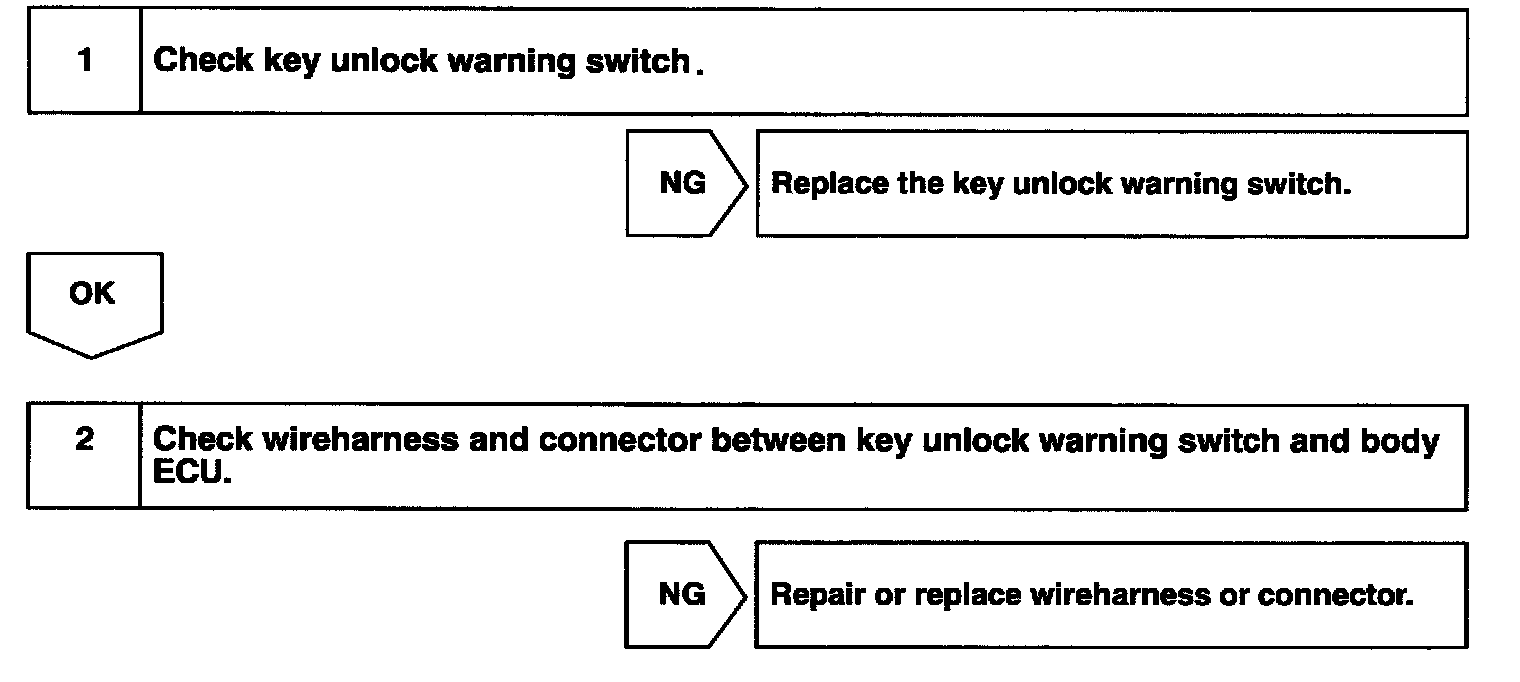 CIRCUIT DESCRIPTIONThe key unlock warning switch goes on when the ignition key is inserted in the key cylinder and goes off when the ignition key is removed.
