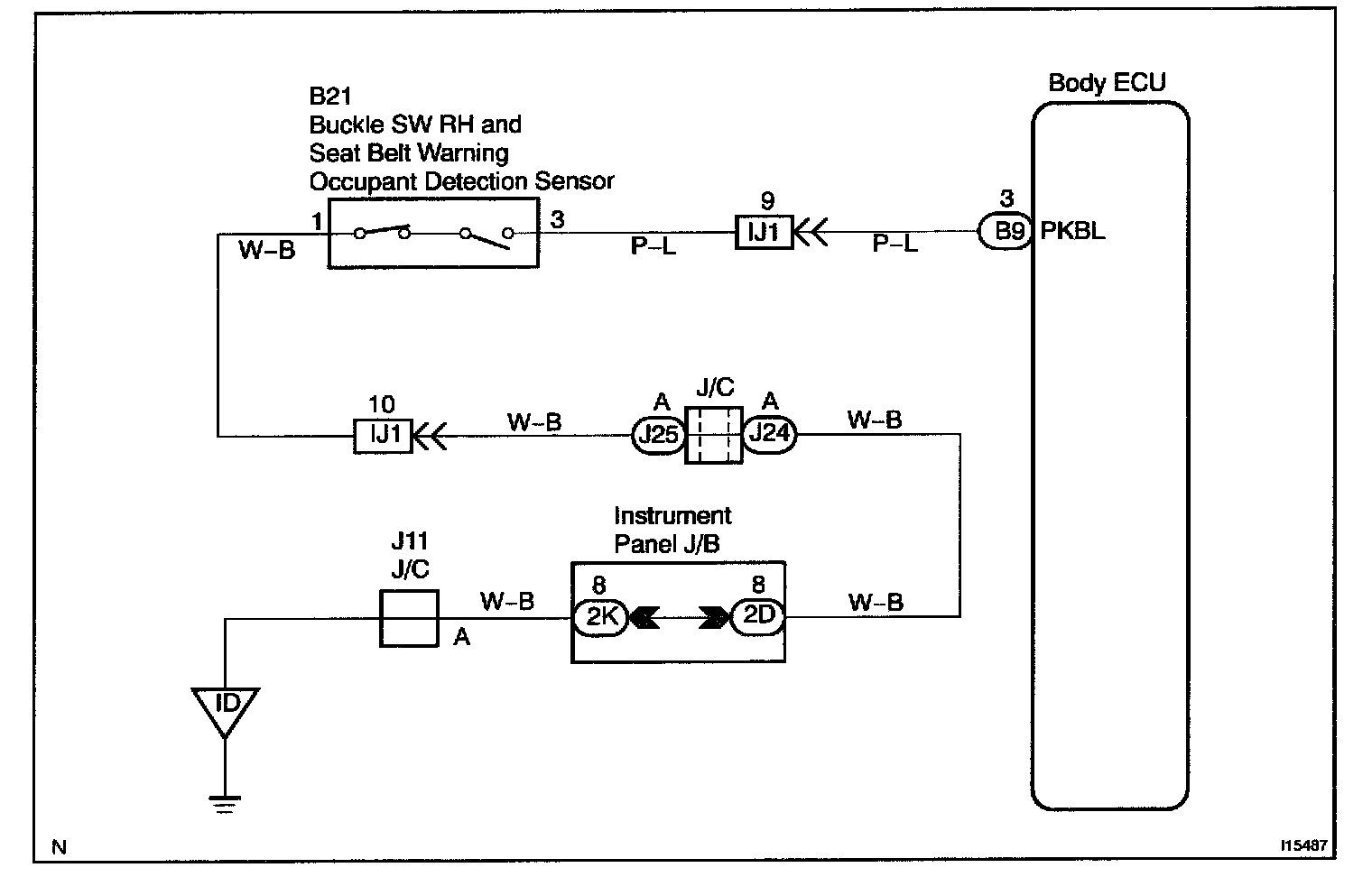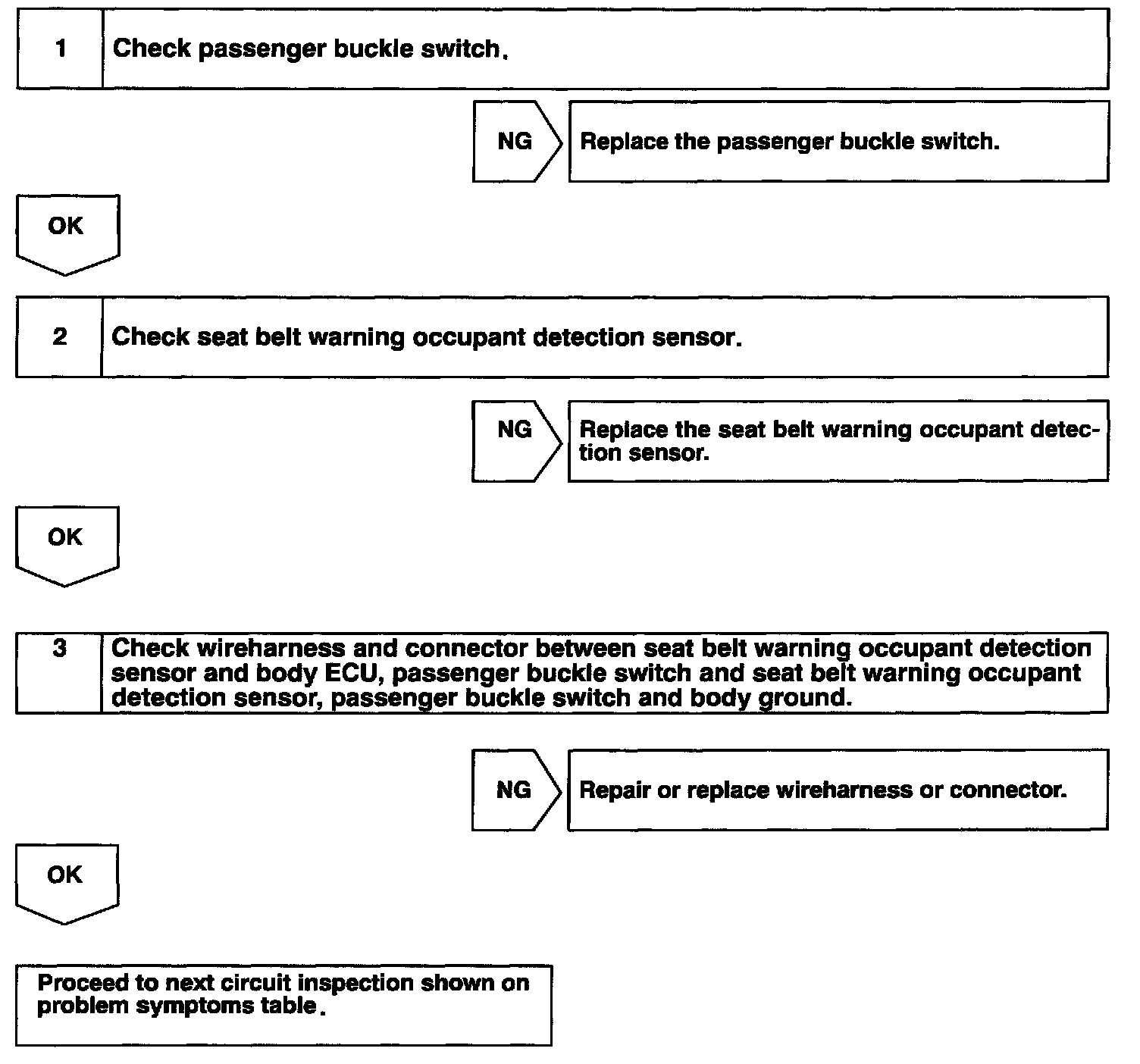 CIRCUIT DESCRIPTIONThis circuit detects the conditions of the passenger buckle switch and the seat belt warning occupant detection sensor, and makes the passenger seat belt warning flash.