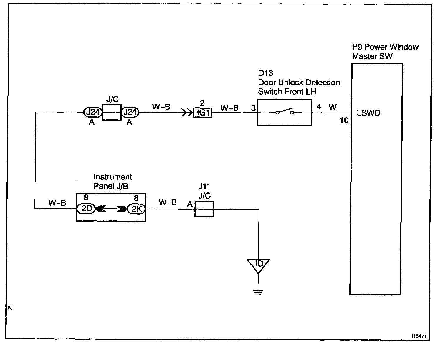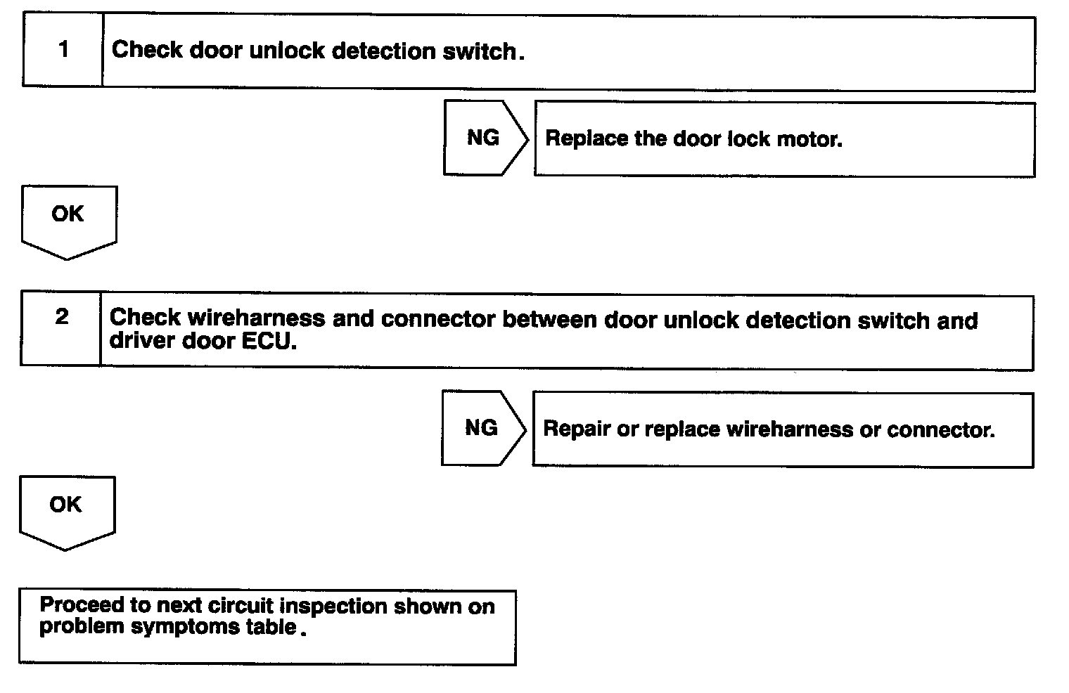 CIRCUIT DESCRIPTIONThe door unlock detection switch is built in the door lock motor assembly. This switch is ON when the door lock knob is in the unlock position and OFF when the lock knob is in the lock position. The ECU detects the door lock knob conditions is this circuit. It is used as one of the operating conditions for the key confinement prevention function.
