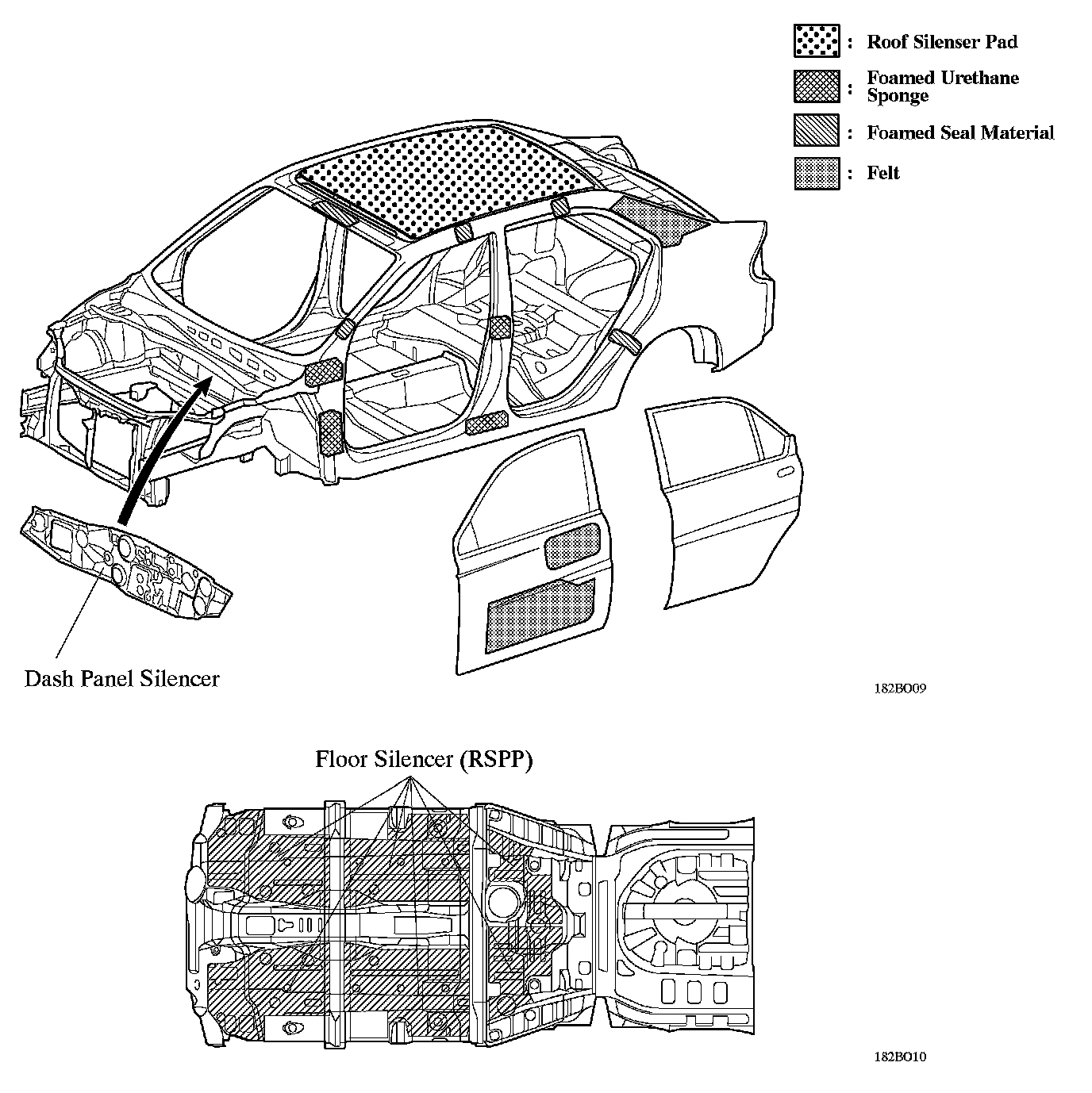 ^ Foamed urethane sponge, foamed seal material, felt and roof silencer pad are applied onto the roof panel and pillars to reduce wind and road noise.
