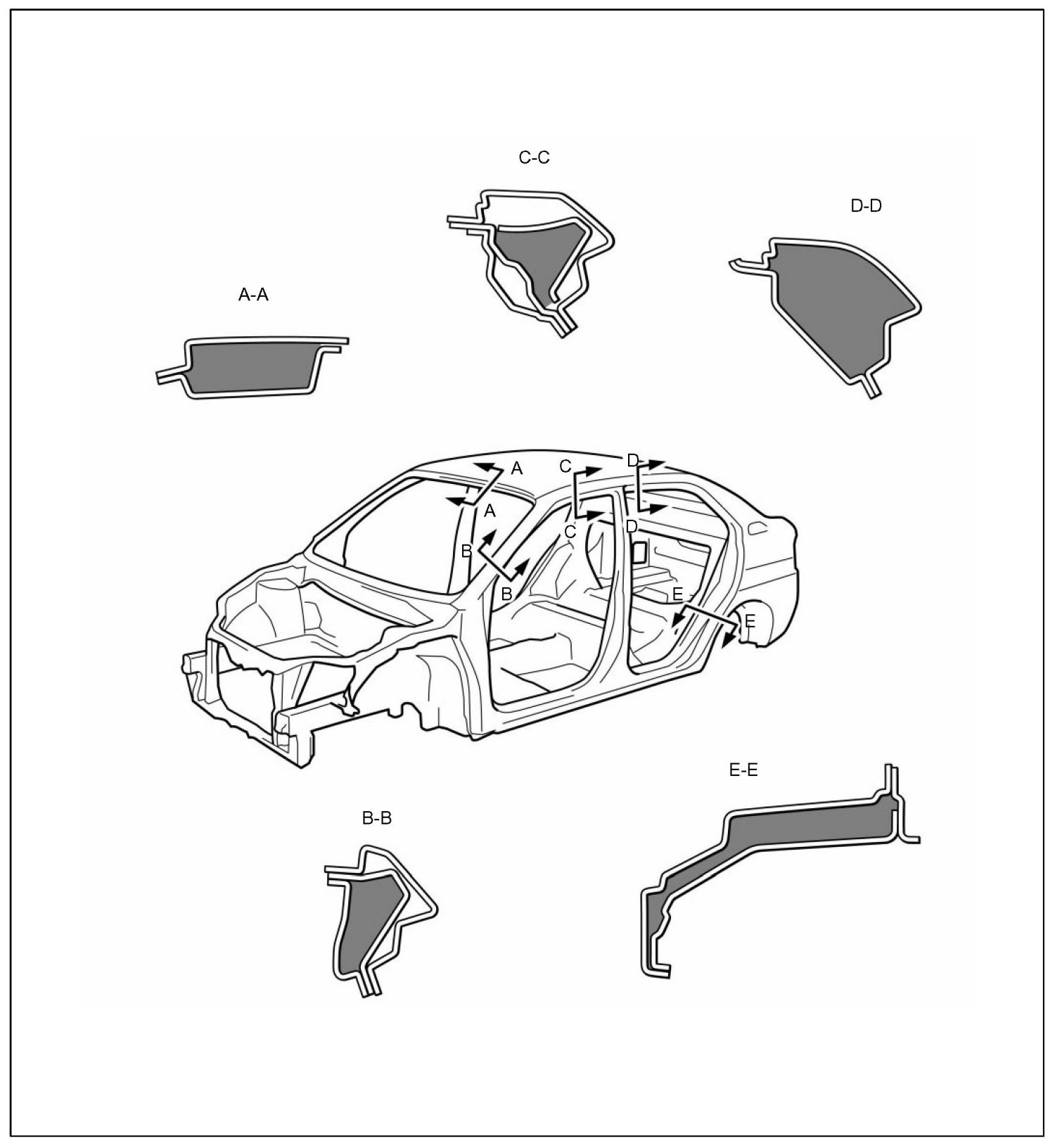 FOAMED MATERIAL APPLICATION AREASThe sections shown in the figure below are filled with foamed material to provide noise insulation. After repairing these sections or their peripheries, refill with foamed materials.
