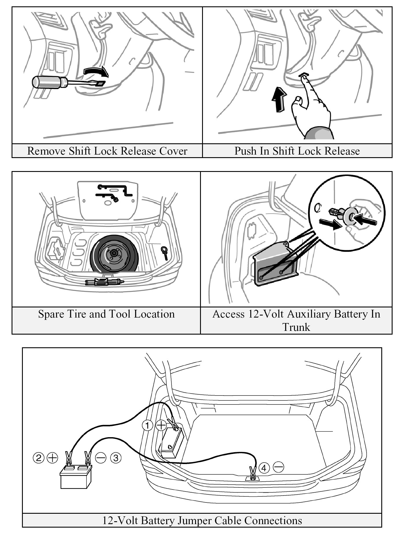 - The 12-Volt auxiliary battery is located in the trunk. Follow the numbered sequence to connect the jumper cables as shown in the illustration.