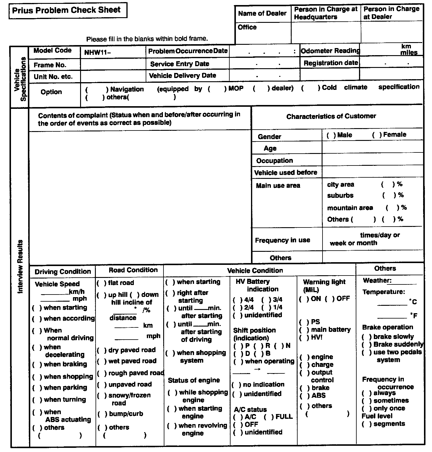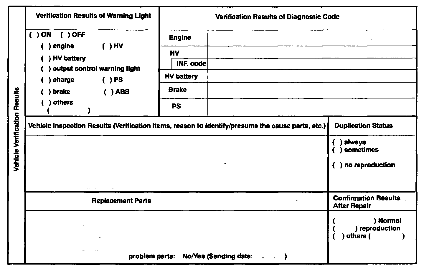 Hybrid Vehicle Control System Check Sheet Part 1: