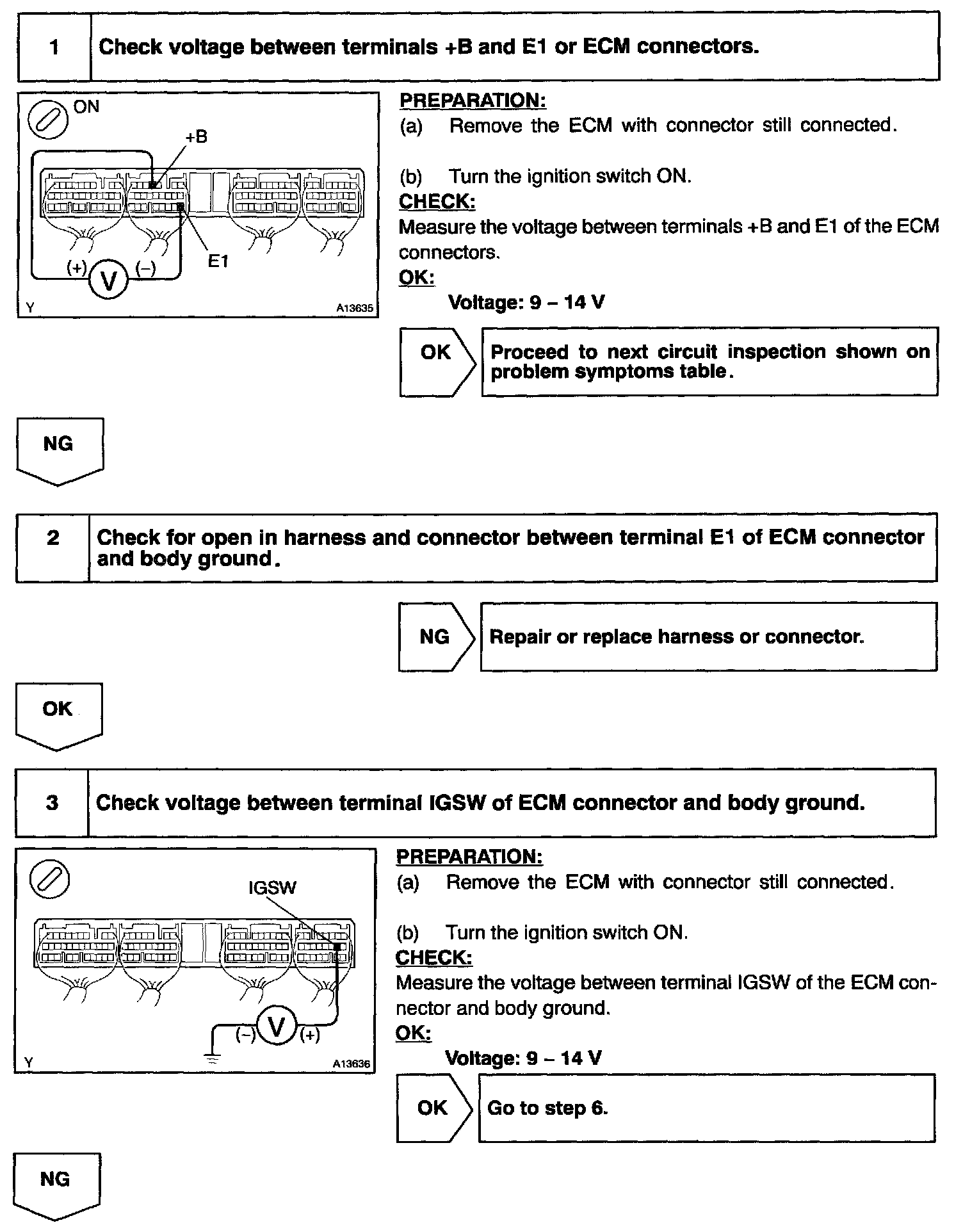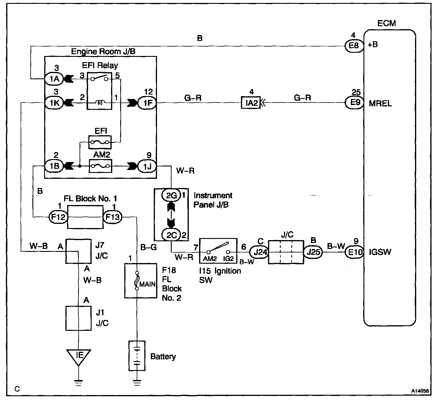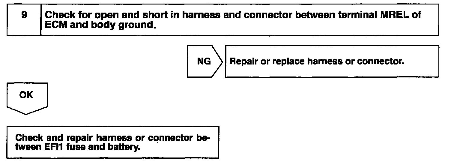 This signal causes current to flow to the coil, closing the contacts of the EFI main relay and supplying power to terminals +B of the ECM.