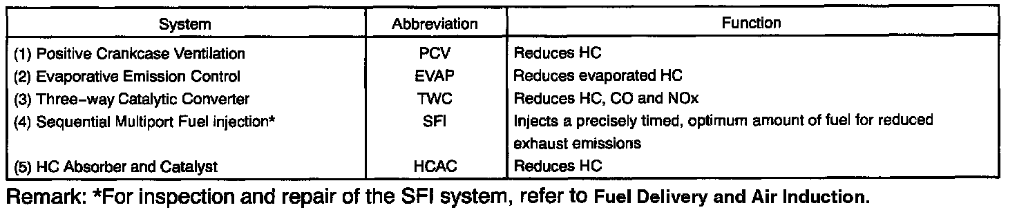 PURPOSEThe emission control systems are installed to reduce the amount of CO, HC and NOx exhausted from the engine ((3) and (4)), to prevent the atmospheric release of blow-by gas-containing HC (1) and evaporated fuel containing HC being released from the fuel tank (2).
