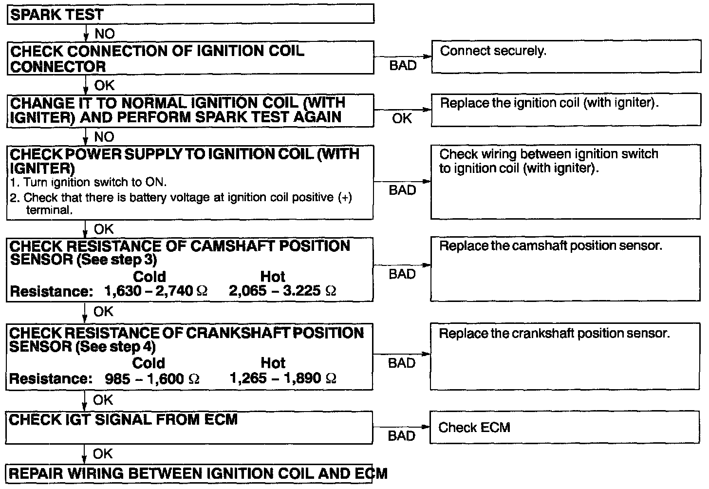 If the resistance is not as specified, replace the crankshaft position sensor.