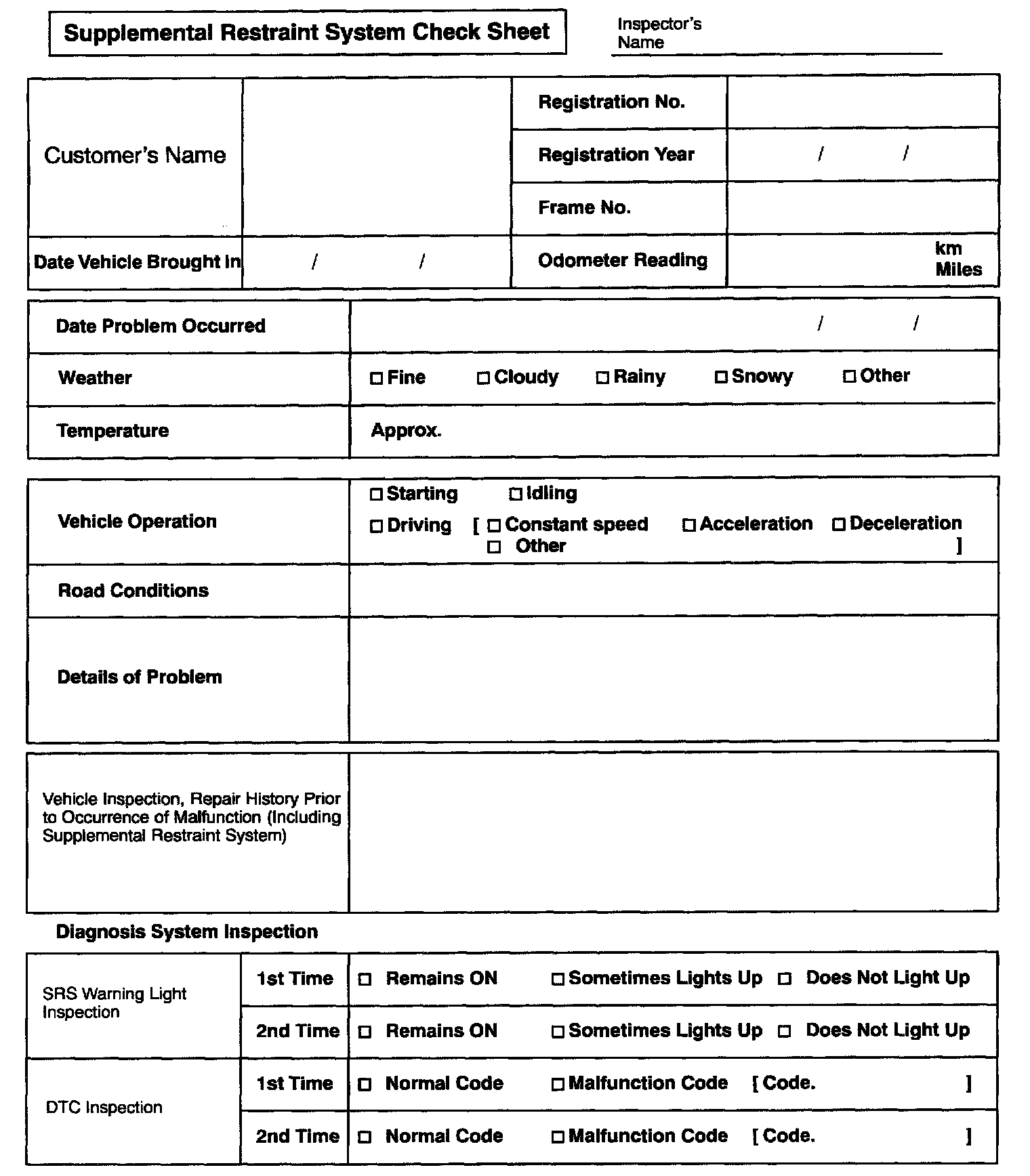 Supplemental Restraint System Check Sheet: