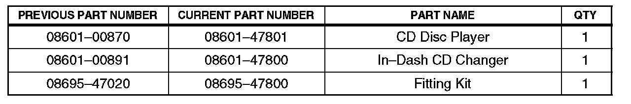 New on the 2003 model year Prius CD Deck and In-Dash CD Changer, the "Y" adapter harness is now built in. Current inventory of the Prius fitting kit for CD Deck and CD Changer (P/N 08695-47020) comes with a separate "Y" adapter harness that is no longer required for 2003 models, and should be discarded and not used. This existing inventory will be exhausted prior to the availability of a fitting kit (P/N 08695-47800) that excludes the "Y" adapter harness.