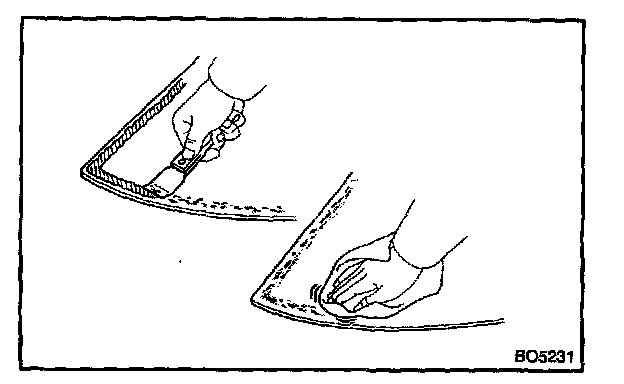 a. Using a brush or sponge, coat the edge of the glass and the contact surface with Primer G as shown in the illustration.