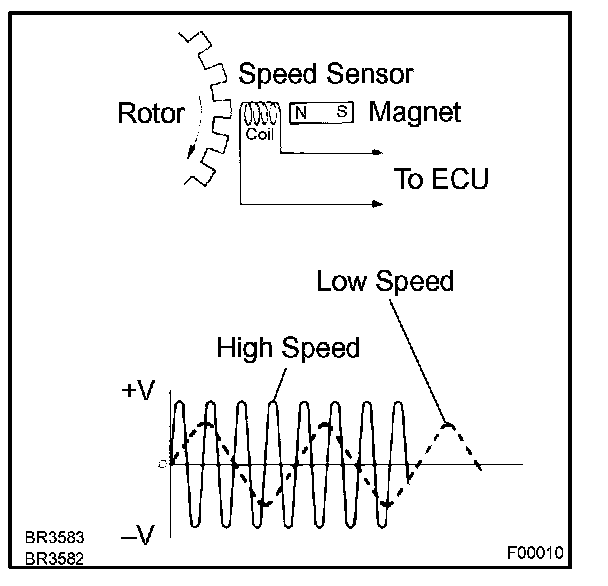 When the rotors rotate, a magnetic field emitted by a permanent magnet in the speed sensor generates an AC voltage. Since the frequency of this AC voltage changes in direct proportion to the speed of the rotor, the frequency is used by the ECU to detect the speed of each wheel.