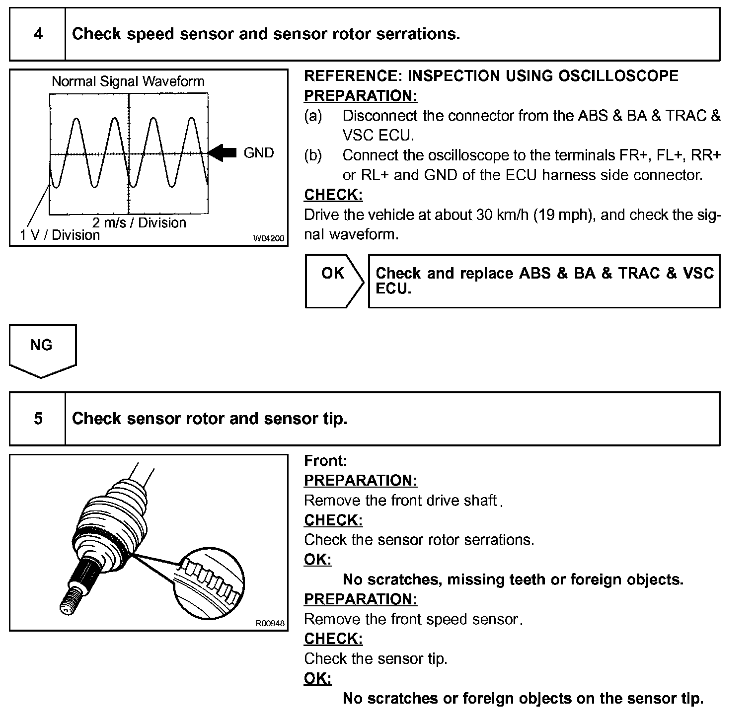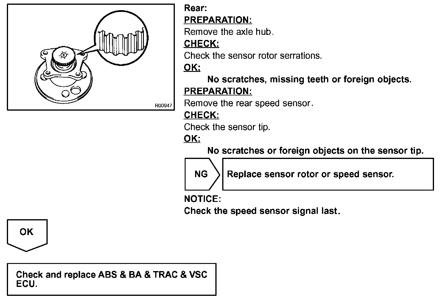 The speed sensor detects a wheel speed and sends the appropriate signals to the ECU. These signals are used to control of the ABS and VSC system. Each of the front and rear rotors has 48 serrations.