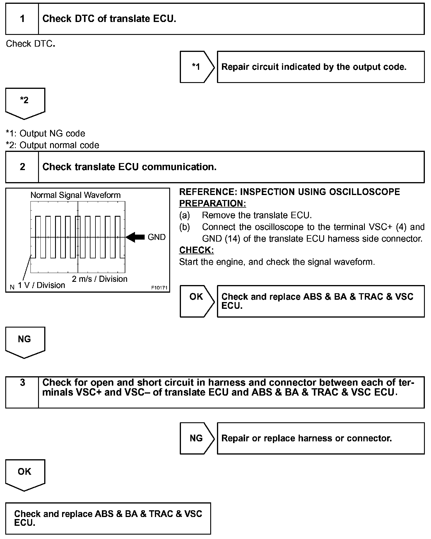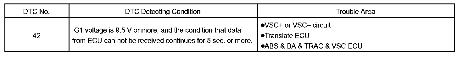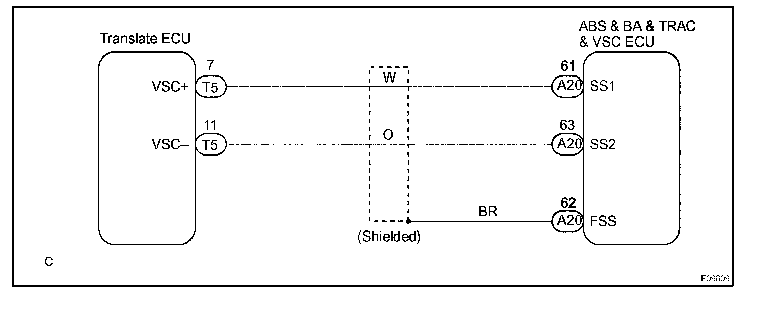 The circuit is used to send TRAC & VSC control information from ABS & BA & TRAC & VSC ECU to the translate ECU (VSC+, VSC-), engine control information and steering angle information from translate ECU to ABS & BA & TRAC & VSC ECU
