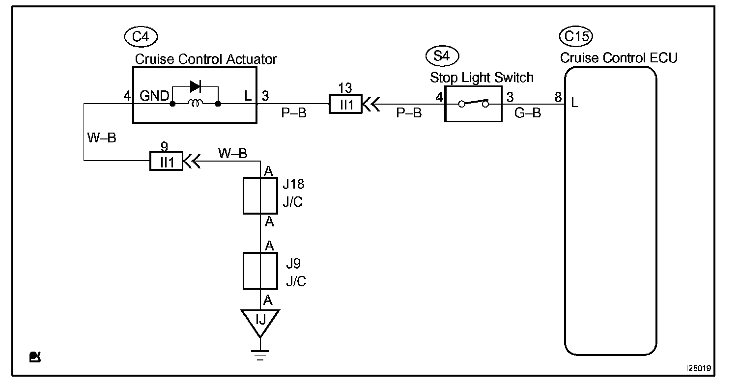 When the brake pedal is depressed, the stop light switch turns on, supplying electrical power to the stop light. Power supply to the magnetic clutch is mechanically cut and the magnetic clutch is turned OFF. When driving downhill, if the vehicle speed exceeds the set speed by 15 km/h (9 mph), the ECU turns the safety magnet clutch OFF. If the vehicle speed later drops to within 10 km/h (6 mph), cruise control at the set speed is resumed.