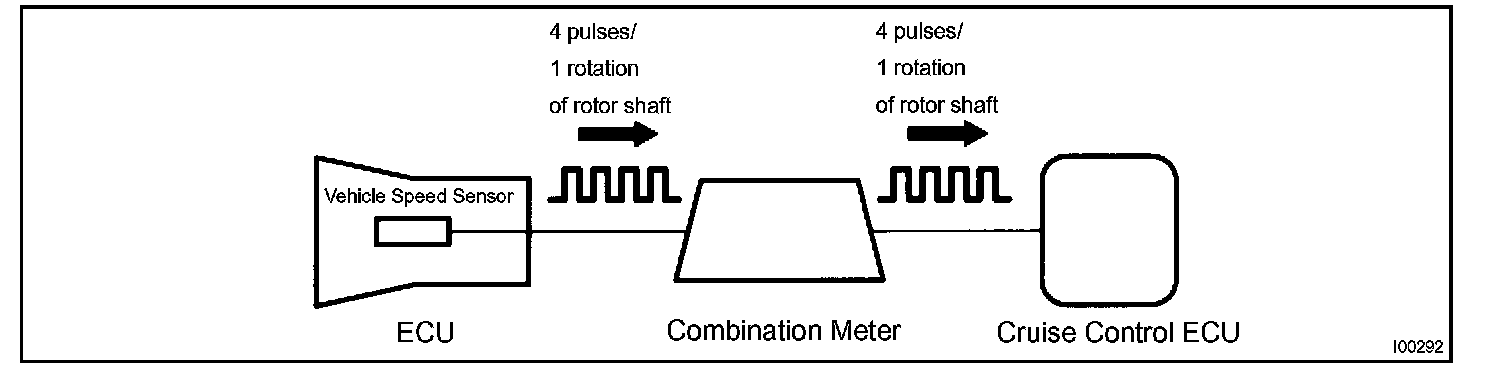 For each rotation of the shaft, the vehicle speed sensor sends a 4-pulse signal through the combination meter to the cruise control ECU (See the installation).