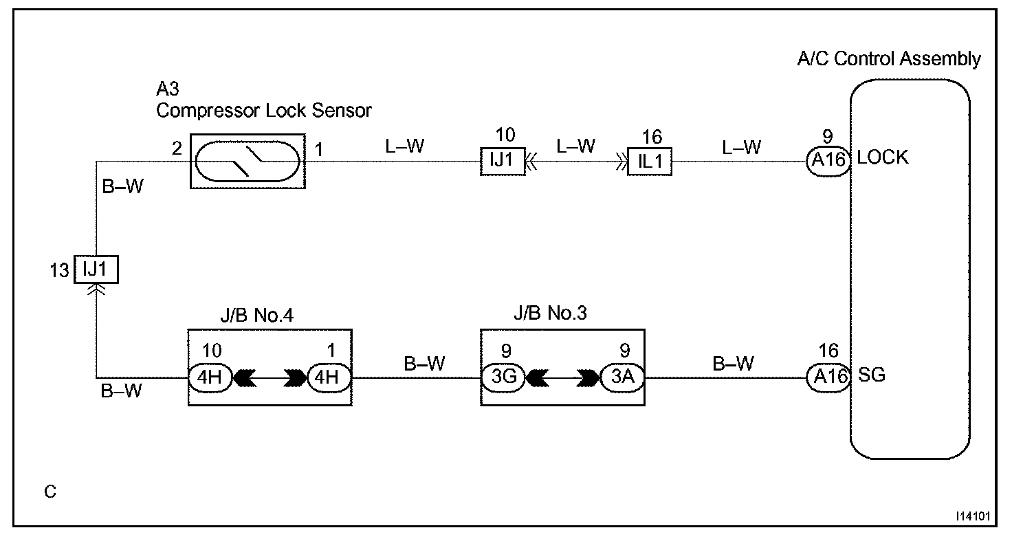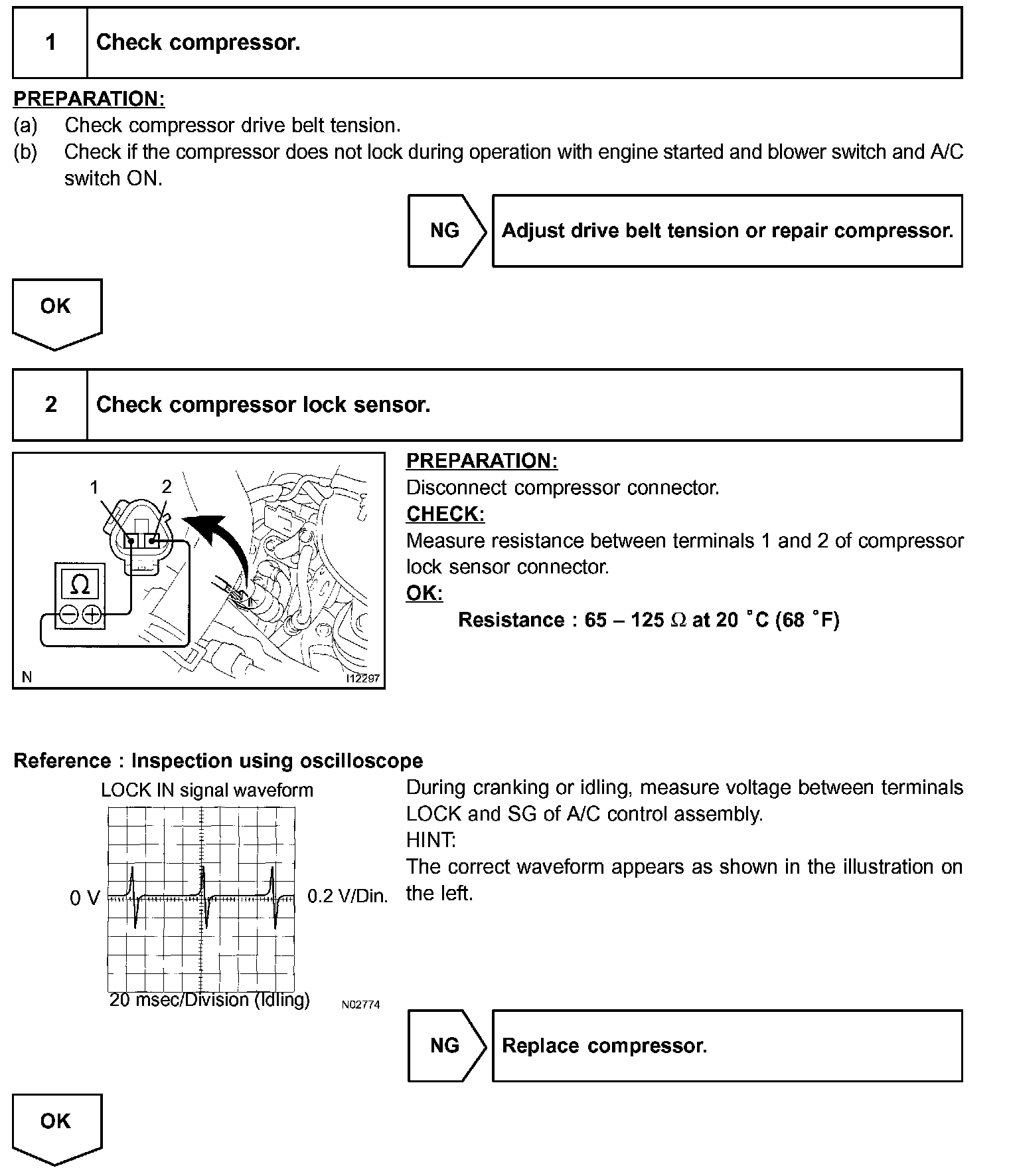 This sensor sends 4 pulses par engine revolution to the A/C control assembly. If the number ratio of the compressor speed divided by the engine speed is smaller than a predetermined value, the A/C control assembly turns the compressor off. And, the indicator flashes at about 1 sec. intervals.