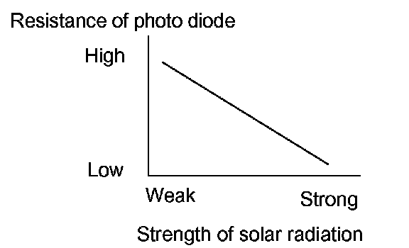 A photo diode in the solar sensor detects solar radiation and sends signals to the A/C control assembly.
