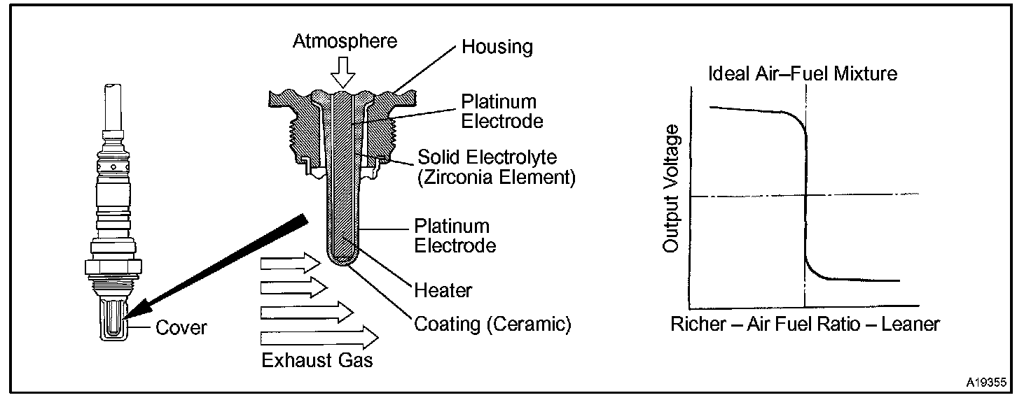 To obtain a high purification rate for the CO, HC and NOx components of the exhaust gas, a three-way catalytic converter is used, but for the most efficient use of the three-way catalytic converter, the air-fuel ratio must be precisely controlled so that it is always close to the stoichiometric air-fuel ratio. The oxygen sensor has the characteristic whereby its output voltage changes suddenly in the vicinity of the stoichiometric air-fuel ratio. This is used to detect the oxygen concentration in the exhaust gas and provide feedback to the computer for control of the air-fuel ratio. When the air-fuel ratio becomes LEAN, the oxygen concentration in the exhaust increases and the oxygen sensor informs the ECM of the LEAN condition (small electromotive force: < 0.45 V).