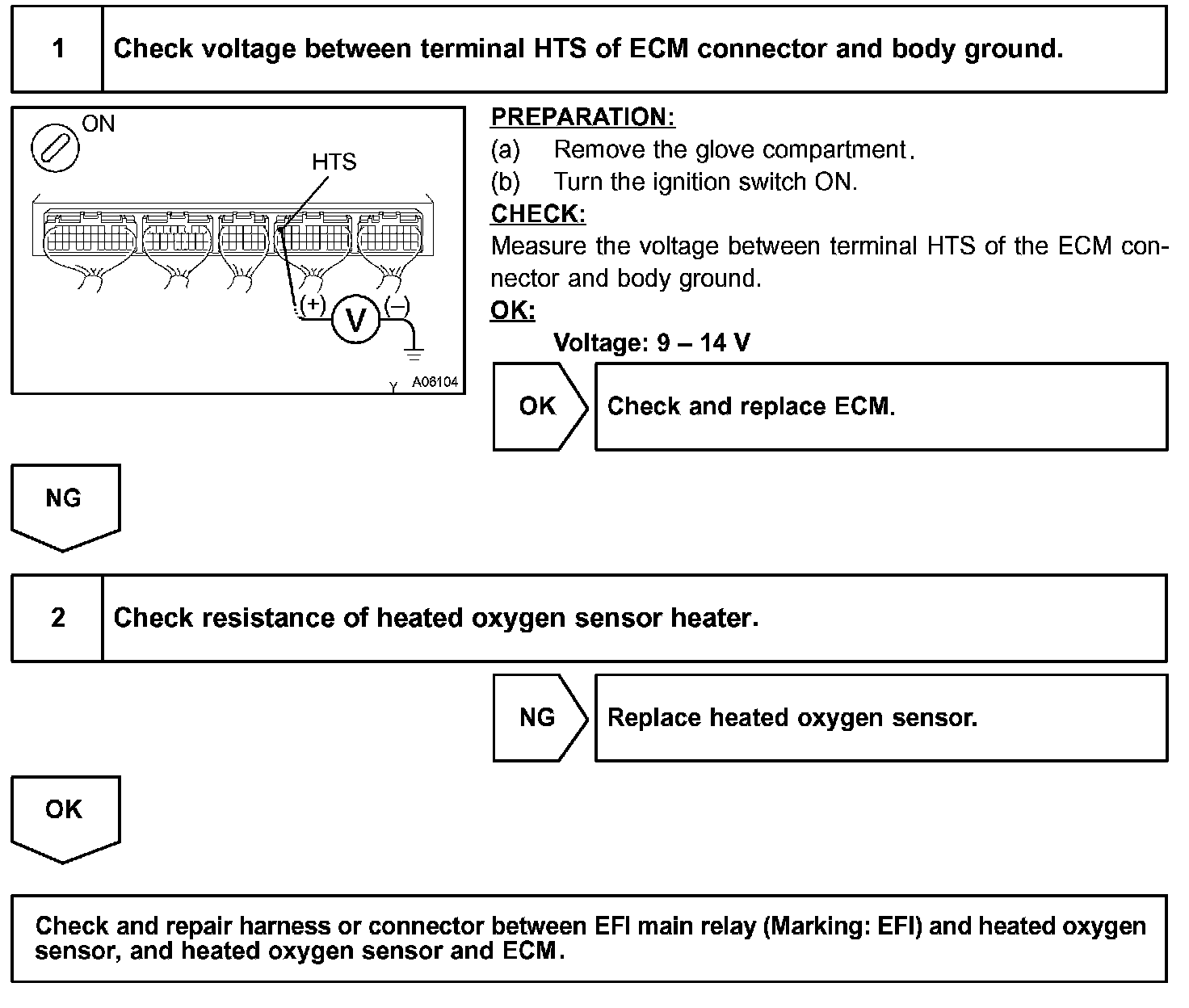 When the air-fuel ratio is RICHER than the stoichiometric air-fuel ratio the oxygen concentration in the exhaust gas is reduced and the oxygen sensor informs the ECM of the RICH condition (large electromotive force: > 0.45 V). The ECM judges by the electromotive force from the oxygen sensor whether the air-fuel ratio is RICH or LEAN and controls the injection time accordingly. However, if malfunction of the oxygen sensor causes output of abnormal electromotive force, the ECM is unable to perform accurate air-fuel ratio control. The main heated oxygen sensors include a heater which heats the zirconia element. The heater is controlled by the ECM. When the intake air volume is low (the temperature of the exhaust gas is low) current flows to the heater to heat the sensor for accurate oxygen concentration detection.